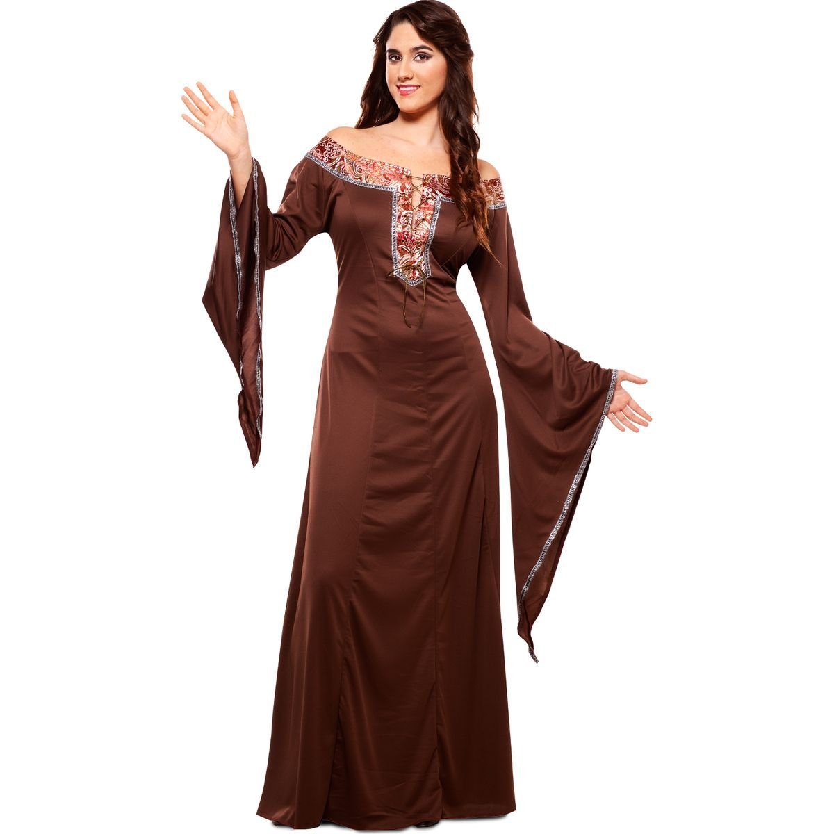 Das schulterfreie Kleid besticht durch seine hellbraune Farbgebung und den riesigen Trompeten-Ärmeln. Die Ärmelenden sind dabei mit einer silberfarbenen Zierborte umfasst. Das Kleid in Renaissance-Optik überzeugt durch den figurbetonten Schnitt, dabei kommt die Taille optimal zur Geltung. Zum absoluten Blickfang wird das mittelalterliche Kleid durch den detailreich, verzierten Brustbereich: hellbraun-rotes Ornamentmuster mit schöner Überkreuz-Schnürung. Ein Reißverschluss am Rücken erleichtert das An- und Ausziehen. Herrschaftlich schön!