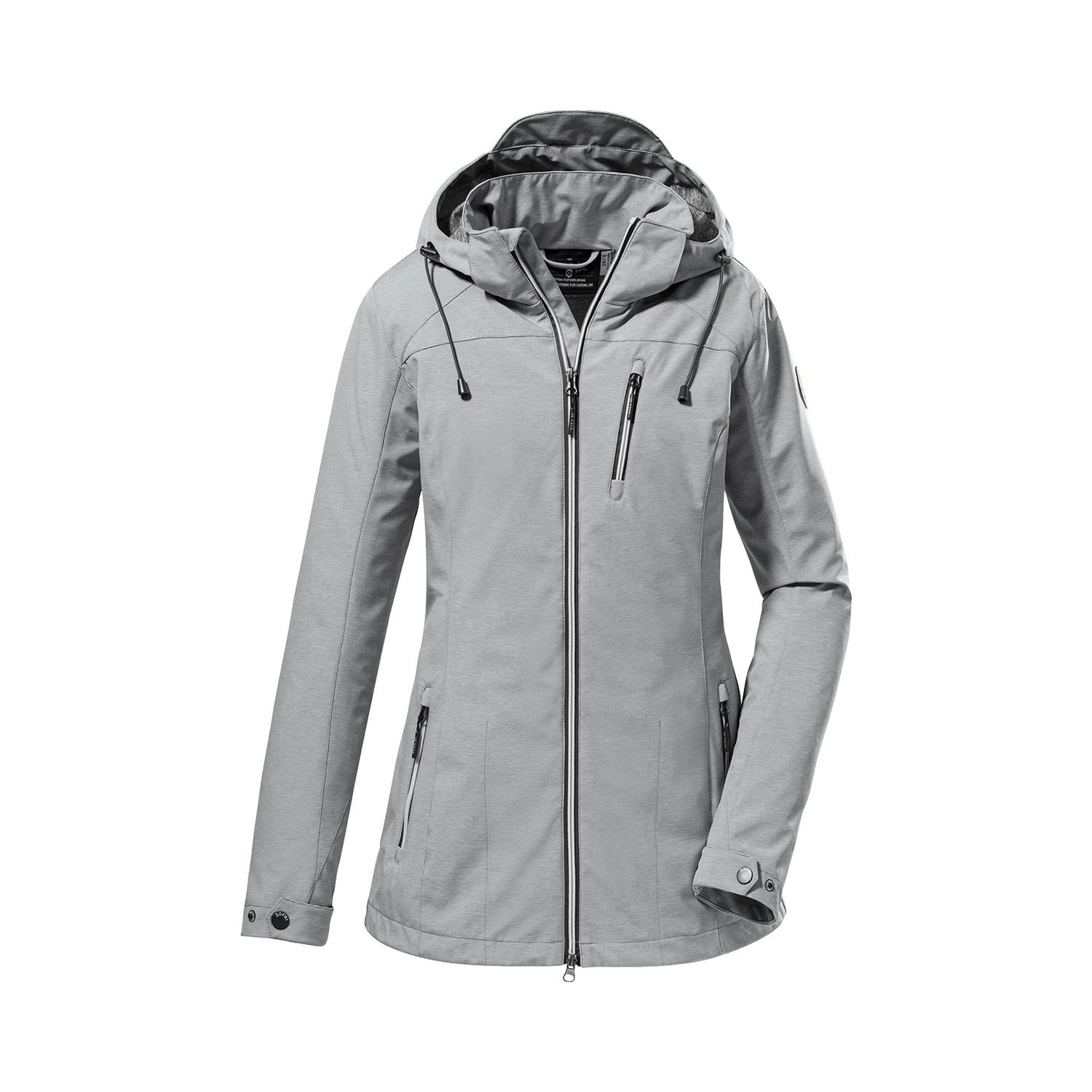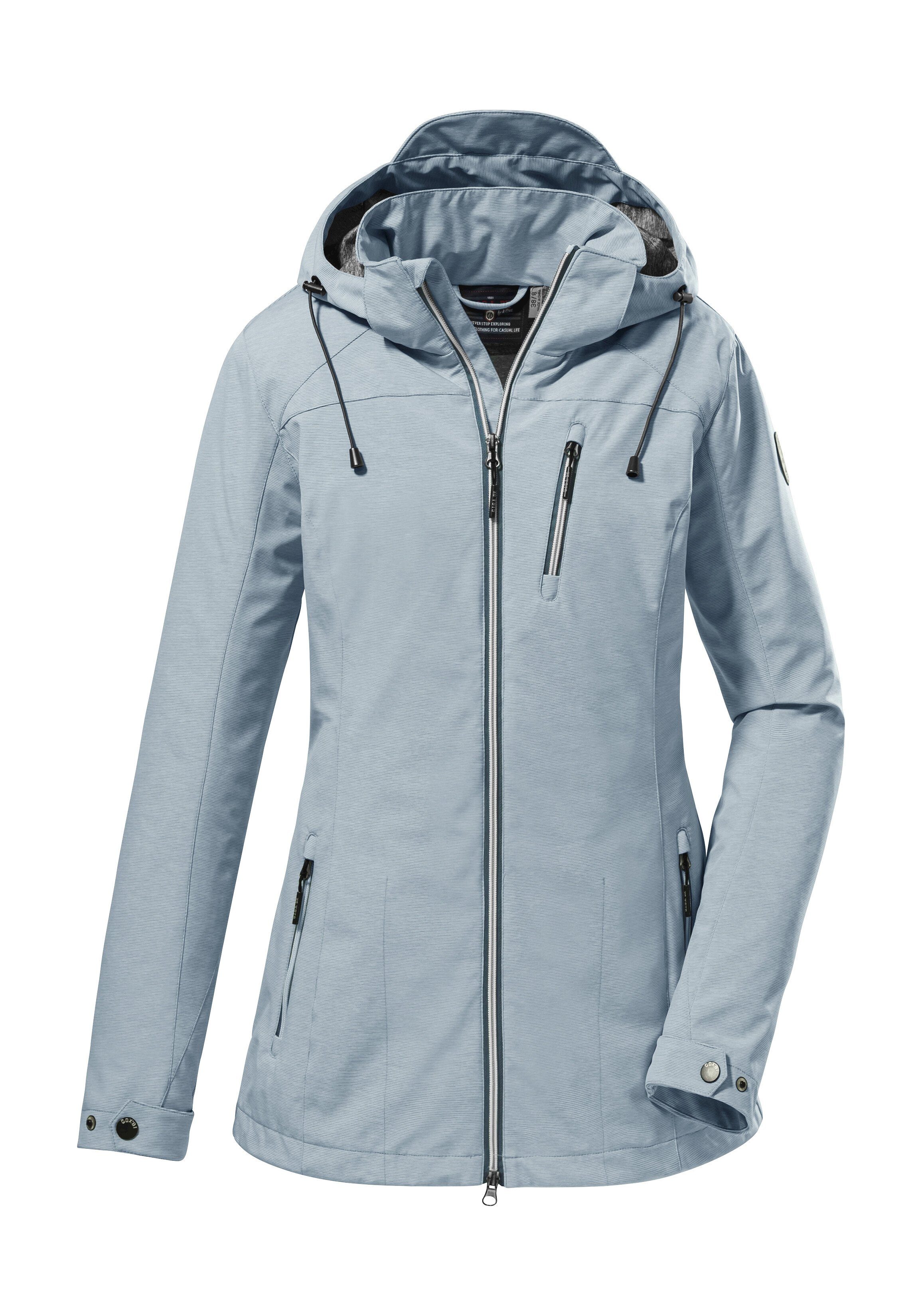 Schönes Grau (nicht blau), dünner als ich mir vorgestellt habe und kein Softshell. Trotzdem schön, Ärmel muss ich umschlagen, etwas längere Form bis unter Gesäß bei 1,60 m.