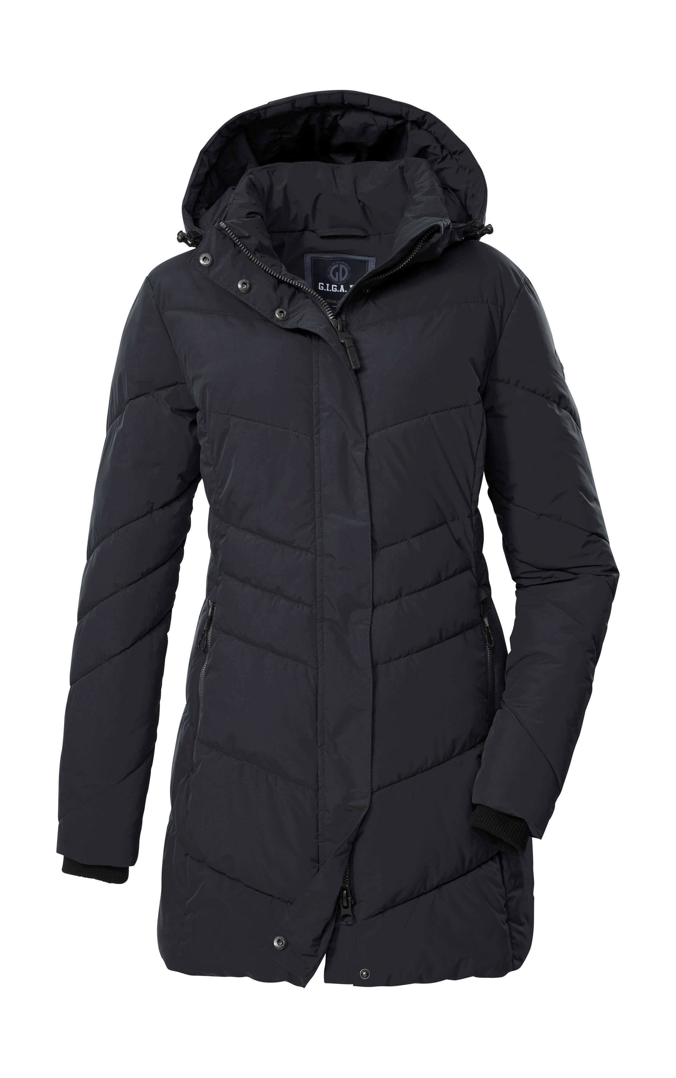 Der Damen Funktionsparka in Daunenoptik von G.I.G.A. DX besticht durch seinen schmalen Schnitt und die figurschmeichelnde Steppung. Der Steppparka ist wasserabweisend und winddicht mit einer 8.000 mm Wassersäule und gleichzeitig atmungsaktiv. Die regulierbare Kapuze lässt sich bei Bedarf abzippen. Die Strickbündchen an den Ärmelabschlüssen halten warm und sind besonders bequem. Die beiden Seitentaschen sind mit Zippern verschließbar, sodass nichts verloren geht. Eine Handytasche im Inneren bietet weiteren Platz. Der verdeckte 2-Wege-Reißverschluss lässt sich von oben und unten öffnen und sorgt so für Bewegungsfreiheit. Außerdem ist er mit einem praktischen Kinnschutz versehen. Dieser Parka wurde PFAs-frei imprägniert und teilweise aus recyceltem Material hergestellt.