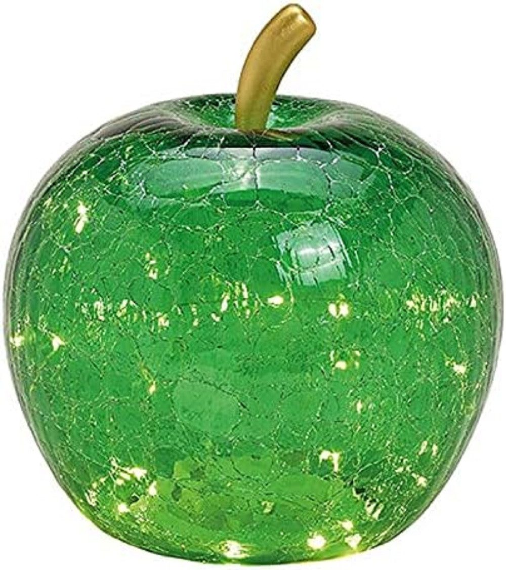 Dieser Apfel in Farbe grün aus Glas ist im Crackle Effekt mit Silber Metallic Farbe gestaltet. Der Stil oben an der Dekoleuchte Apfel ist Gold Farben. Im Inneren des Deko Apfels aus Glas ist eine LED Lichterkette verborgen. Diese hat 20 Lämpchen und wird per Batteriefach auf der Unterseite des Apfels betrieben. Es gibt einen Ein- / Ausschalter um die coole Apfel Lampe zu betreiben. Auch unbeleuchtet ist der Deko Apfel aus Glas schon ein Hingucker - sobald die LED's im eingeschaltet werden ist die Dekoleuchte Apfel aber wirklich etwas Besonderes. Die Apfel Lampe sorgt für warmes Licht und ist wirklich ein Blickfang. Bitte beachten Sie, dass die Batterien (3xAA) nicht im Lieferumfang enthalten sind.