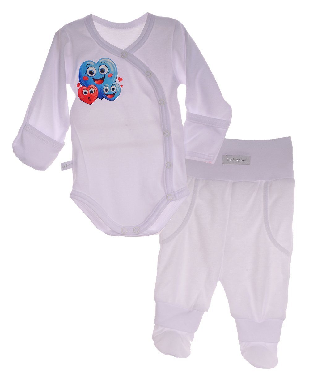 Dieses liebevoll gestaltete 2-teilige Baby Set besteht aus einem Wickelbody mit Herzchen-Aufdruck und einer passenden Hose mit Füßchen – beide in zeitlosem Weiß gehalten. Der Body verfügt über extra lange Ärmel mit integrierter Kratzschutz-Funktion und praktische Druckknöpfe an der Seite, die das An- und Ausziehen besonders angenehm machen. Die weiche Hose hat einen elastischen Bund, der für einen bequemen Sitz sorgt, ohne einzuengen. Hergestellt aus reiner Baumwolle, mit Bündchen aus 95% Baumwolle und 5% Elasthan, ist dieses Set besonders sanft zur zarten Babyhaut. Ein ideales Basic für die Erstausstattung – neutral gestaltet für Baby Jungen und Mädchen.