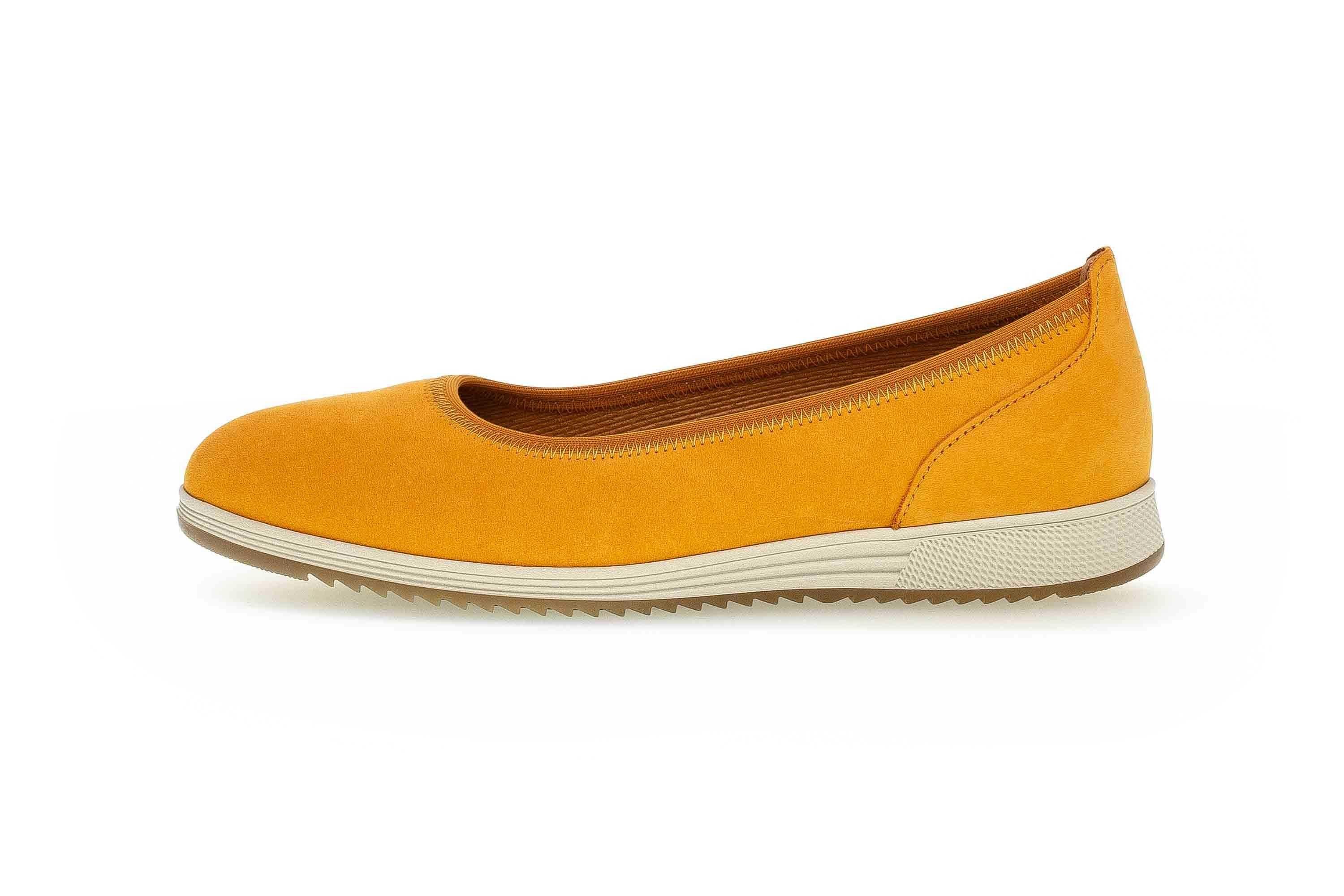 Bei diesem formschönen Schuh der Marke Gabor handelt es sich um ein Modell aus der Kategorie Ballerinas. Diese Damenschuhe in der Farbe Gelb überzeugen durch ein klares Design und unterstreichen die aktuelle Schuhmode. Große Schuhe von Gabor lassen sich perfekt mit dem urbanen Modegeist kombinieren und verleihen jedem modernen aber auch einem klassisch-sportivem Outfit den passenden Schliff. Das Außenmaterial bei diesem Modell wurde aus Rauleder hergestellt, als Innenmaterial wurde Vlies verwendet. Bei diesen Schuhen kann als Weite Normale Weite (F) berücksichtigt werden. Die Latex-Sohle sorgt jederzeit für einen guten Auftritt und ein mit einer Höhe von 1,0 cm sorgt für die harmonische Silhouette.