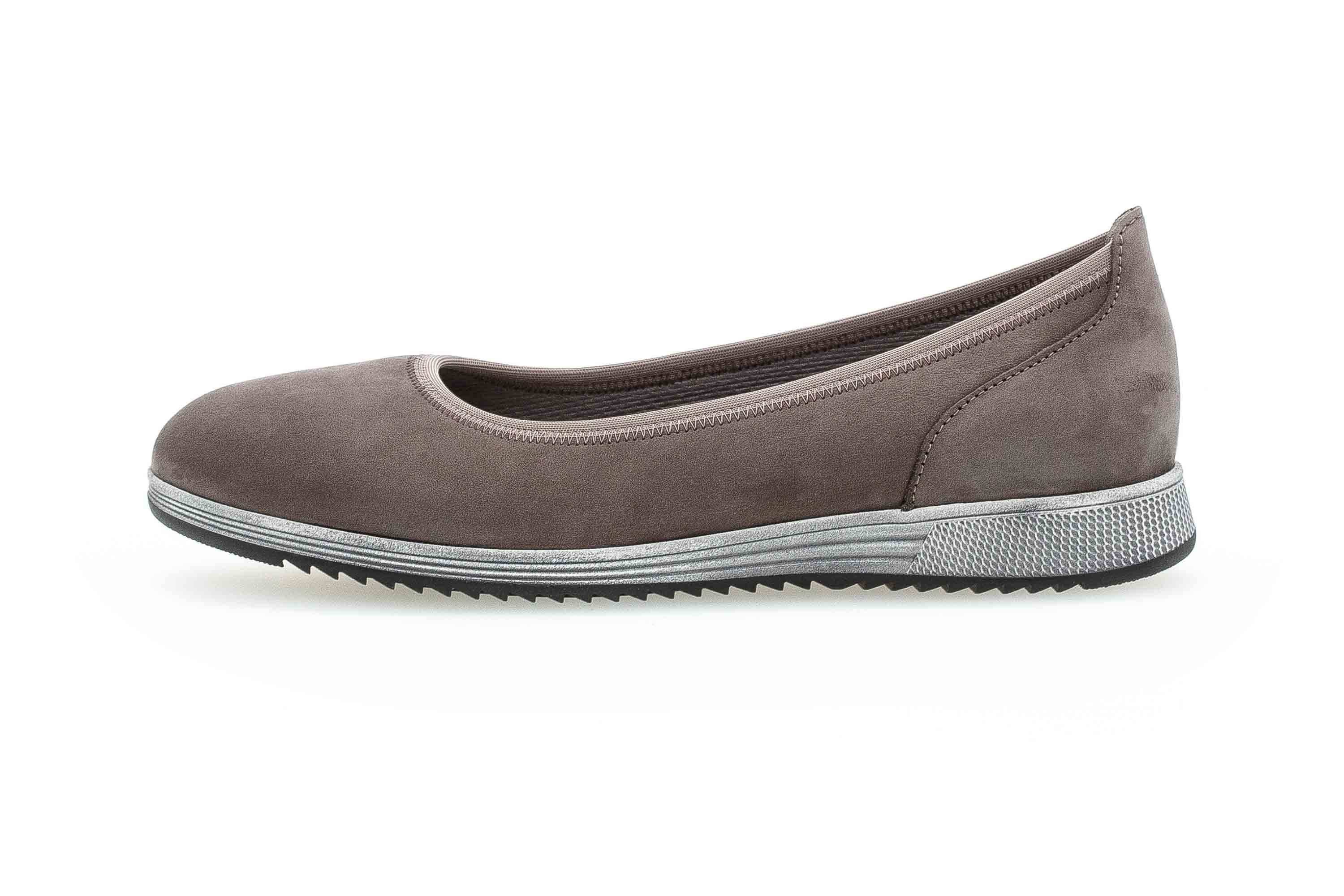 Bei diesem formschönen Schuh der Marke Gabor handelt es sich um ein Modell aus der Kategorie Ballerinas. Diese Damenschuhe in der Farbe Grau überzeugen durch ein klares Design und unterstreichen die aktuelle Schuhmode. Große Schuhe von Gabor lassen sich perfekt mit dem urbanen Modegeist kombinieren und verleihen jedem modernen aber auch einem klassisch-sportivem Outfit den passenden Schliff. Das Außenmaterial bei diesem Modell wurde aus Rauleder hergestellt, als Innenmaterial wurde Vlies verwendet. Bei diesen Schuhen kann als Weite Normale Weite (F) berücksichtigt werden. Die Latex-Sohle sorgt jederzeit für einen guten Auftritt und ein mit einer Höhe von 1,0 cm sorgt für die harmonische Silhouette.