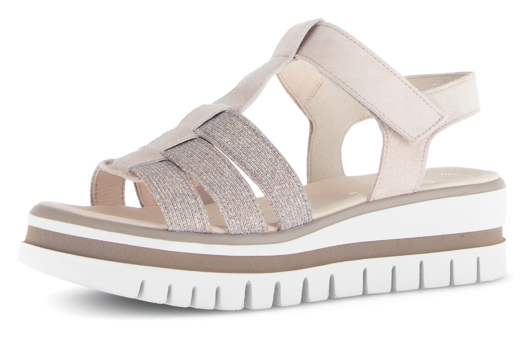 Mit dem Obermaterial aus Textil und Ziegenveloursleder sind die Schuhe kaum schmutzempfindlich, leicht und strapazierfähig. Die profilierte Synthetik-Sohle der Sandaletten sorgt für mehr Rutschfestigkeit auf unebenem Untergrund. Die gepolsterte Leder-Innensohle sorgt für zusätzlichen Komfort bei jedem Schritt. Dank dem Keilabsatz sind die Sandaletten ideal für den Alltag und lange Tragezeiten. Diese Sandaletten in Weite F sind für schmale bis normale Füße geeignet.