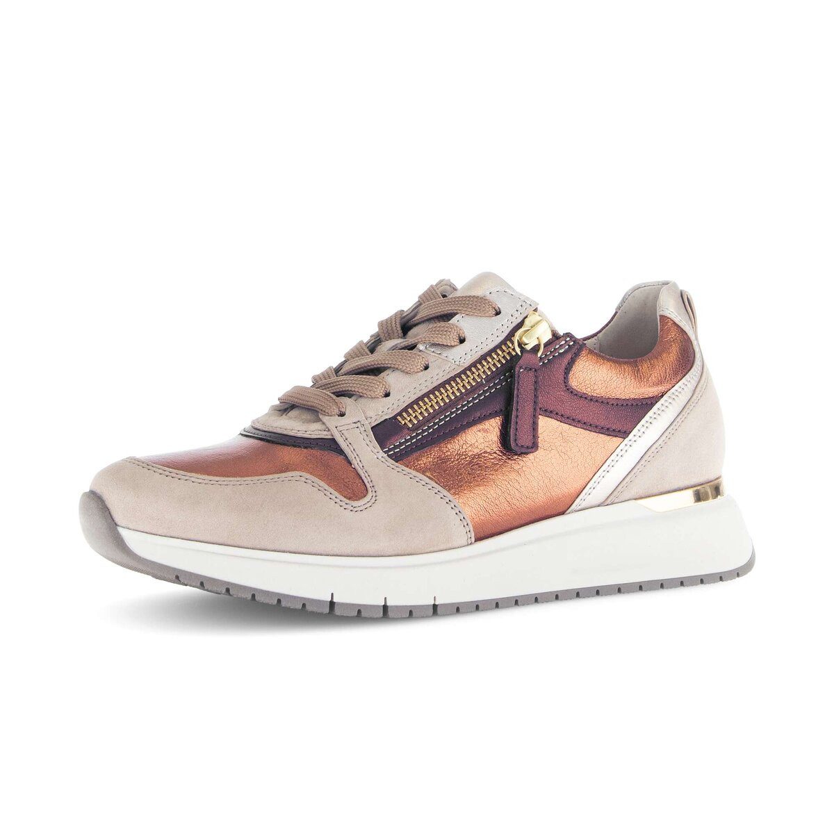 Die bequemen Gabor comfort Sneaker low in beige sind die optimale Wahl für stilsichere Damen. Das Obermaterial besteht aus einem wertigem Materialmix aus Leder und verleiht dem Sneaker seine unverkennbare Optik. Schuhweite H (weit) bedeutet, dass die Sneaker perfekt für kräftigere und breitere Damenfüße geeignet sind. Dieses Modell zeichnet sich durch ein Wechselfußbett aus recyceltem Material aus, das nicht nur den Komfort fördert, sondern auch einen ressourcenbewussten Ansatz unterstützt. Der Sneaker der Linie comfort besitzt mehr Volumen im Ballen- und Ristbereich sowie zusätzlichen Raum für die Zehen und gibt dem Fuß Stabilität. Das Modell ist mit einem Wechselfußbett ausgestattet, das ohne Впередes gegen orthopädische Einlegesohlen getauscht werden kann.