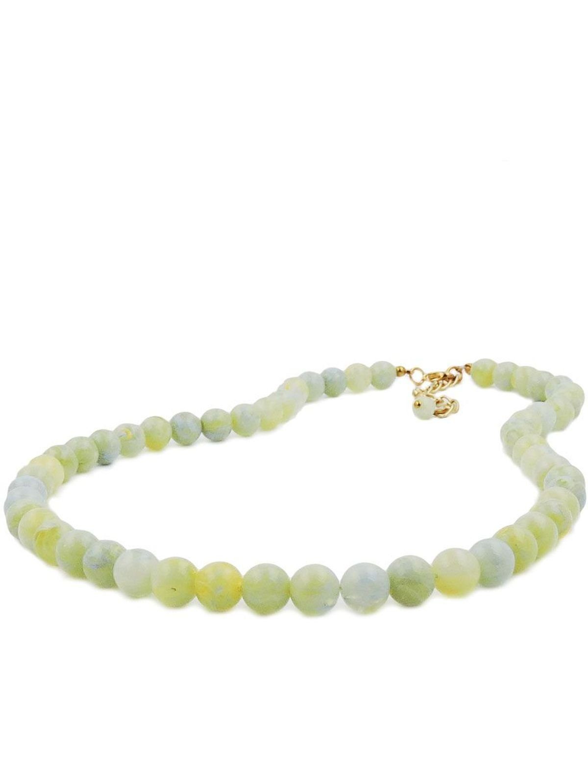 Die zeitlos schöne Halskette mit den hell-marmorierten Perlen ist die perfekte Ergänzung zur sommerlichen Kleidung. Bei diesen hochwertigen 10mm-Kunststoffperlen wurden die Farben Türkisgrün, Weiß und Gelb toll vermischt und jede Perle ist dadurch einzigartig. Die klassisch gefädelte, 50cm lange, im Volksmund - Kullerkette - genannte Perlenkette wird mit einem goldfarbenen Karabiner plus Verlängerungskettchen aus eloxiertem Aluminium und einer passenden Perle als Abschluss verschlossen. Все Bestandteile dieser Modeschmuck-Kette wurden in Deutschland produziert und die Kette selbst in Handarbeit - made in germany - fertiggestellt. Abmessung: 10mm Длина: 50cm Material: Kunststoff Farbe: türkis - grün - gelb Preis per 1 Stck