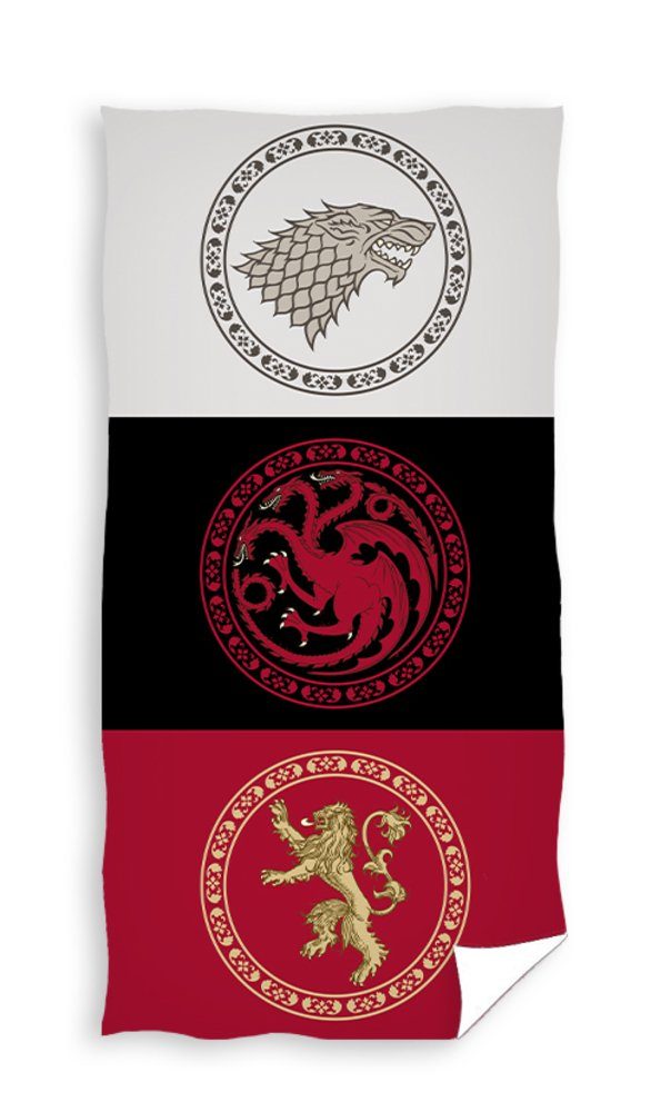 Wir empfehlen das bunte und angenehm griffige Badetuch mit den Maßen 70x140 cm: GAME OF THRONES.
