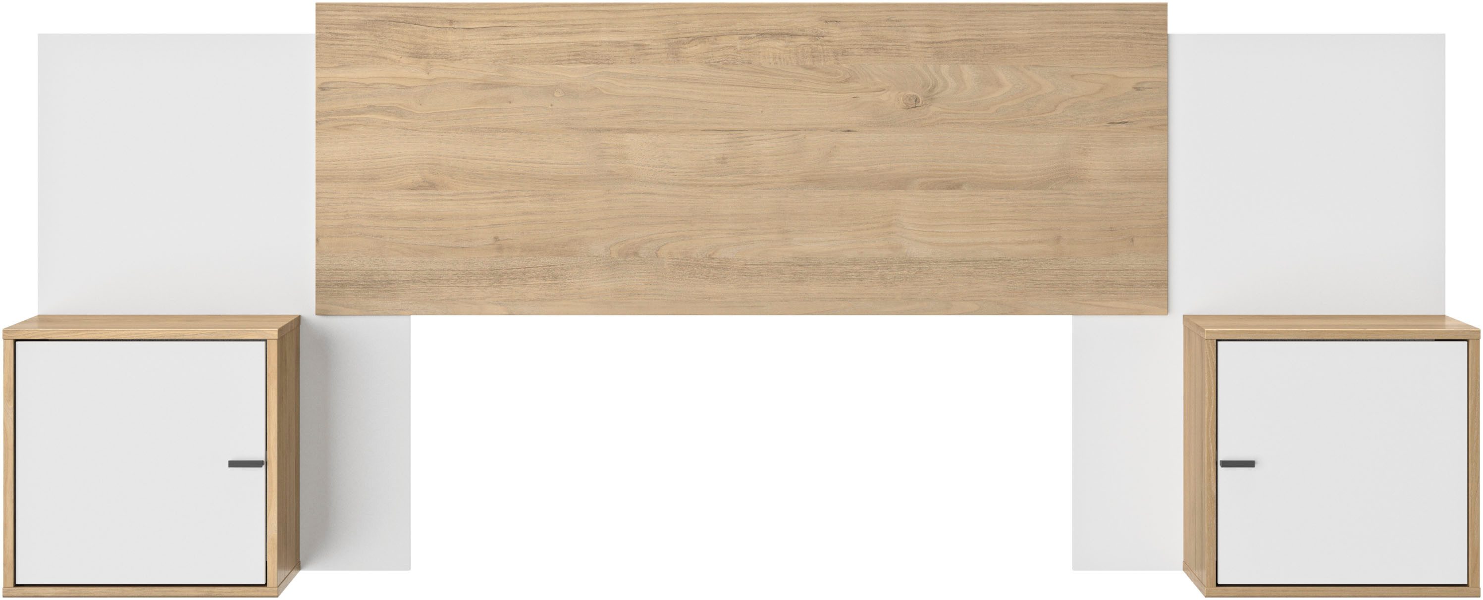Information Materialzusammensetzung | Enthält: 1 Kopfteil und 2 Nachttische mit je 1 Tür., Für Polsterbetten in den Breiten 120 cm, 140 cm und 160 cm, Griffe: Anthrazitfarbener ABS-Kunststoff., Struktur und Fronten: Spanplatten mit Papierdekor in naturgetreuer Kastanienoptik und Uni-Weiß, Kanten in gleichen Ausführungen. |