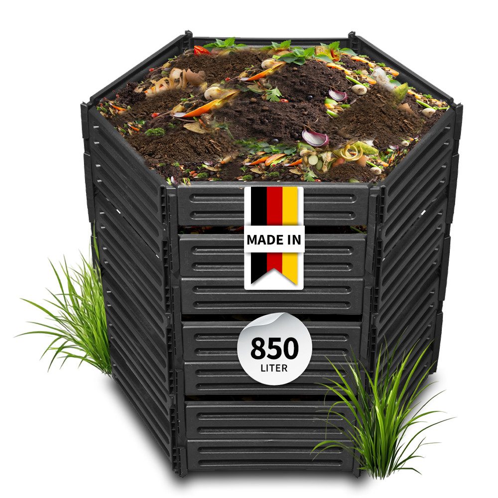Garantia Air-King Komposter 850 Liter - einfach und praktisch. Dieser offene Steckkomposter aus der GARANTIA Basic Line dient der Entsorgung Ihrer organischen Abfälle und gleichzeitig der Gewinnung wertvoller Komposterde. Die großzügigen Lüftungsschlitze dienen der ausreichenden Sauerstoffzufuhr und bedingen somit einen optimalen Zersetzungsprozess und eine schnelle Kompostierung. Der Komposter kann einfach und problemlos durch sein praktisches Stecksystem zusammengebaut werden. Der Aufbau ist somit kinderleicht und in fünf Minuten ohne Werkzeug erledigt. Es ergibt sich eine Grundfläche von 111 x 97 cm und eine Höhe von 105 cm, was einem Fassungsvermögen von 600 Litern entspricht. Die Qualität steht bei GARANTIA im Vordergrund! Hochwertige Recyclingkunststoffe, modernste und nachhaltige Produktionsverfahren, innovatives Design sowie ein einfaches Handling – das sind die Grundlagen der GARANTIA Premium Qualität made in Germany. Ihr Komposter ist Witterungseinflüssen und starken Temperaturschwankungen ausgesetzt. Auf diese Bedingungen abgestimmte Materialien, mit zusätzlichem UV-Schutz, sorgen für eine lange Lebensdauer im Freien. Die Einwirkung des UV-Lichts wird auf ein Minimum reduziert. Ihr Komposter wird aus Recyclingkunststoff hergestellt und ist zu 100 % recycelbar.