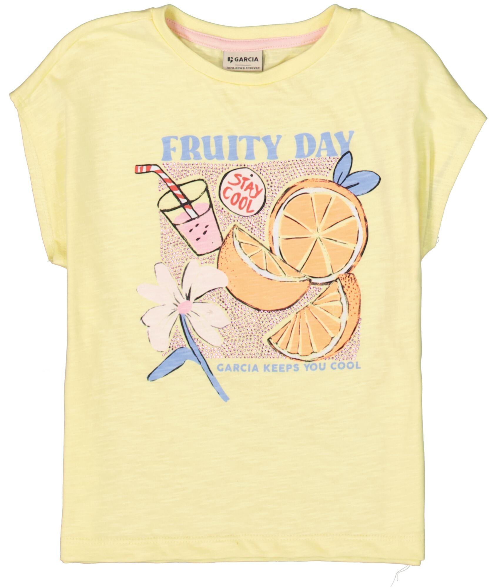 Das "Fruity Day" T-Shirt von Garcia für Mädchen bietet mit seinem lebhaften Obst-Print ein fröhliches Design, das ideal für den täglichen Gebrauch ist. Hergestellt aus 100% Baumwolle, gewährleistet es Komfort und ist sanft zur Kinderhaut. Verfügbar in Größen 92 bis 134, ist es perfekt für Kinder von etwa zwei bis neun Jahren. Dieses vielseitige T-Shirt lässt sich leicht mit verschiedenen Outfits kombinieren und ist ein stilvolles Must-Have für kleine Modefans.