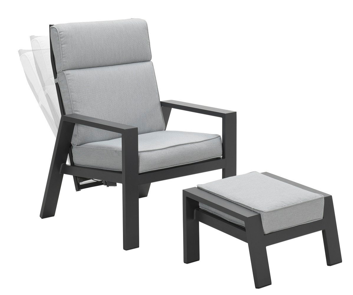 Luxus Lounge-Sessel mit verstellbarer Rückenlehne und Fußbank, das ist das Model Max. Optimal für den Garten, die Terrasse oder den Balkon. Das Set besteht aus einem komfortablen Lounge-Sessel mit verstellbarer Rückenlehne und einer dazu passenden Fußbank. Der Max Lounge-Sessel und die Fußbank bestehen komplett aus Aluminium. Das Aluminium hat eine schützende Pulverbeschichtung in carbon black. Der Sessel ist ausgestattet mit einer verstellbaren Rückenlehne, hiervon befindet sich der Handgriff an der Seite des Stuhls und die Rückenlehne ist hiermit ganz einfach und stufenlos in die gewünschte Position zu bringen. Die mitgelieferten und extra dicken Kissen haben einen hohen Sitzkomfort und runden das Relax-Set ab. Die Kissen sind außerdem mit Reißverschlüssen versehen – dies erleichtert die Reinigung des Bezugs ungemein.