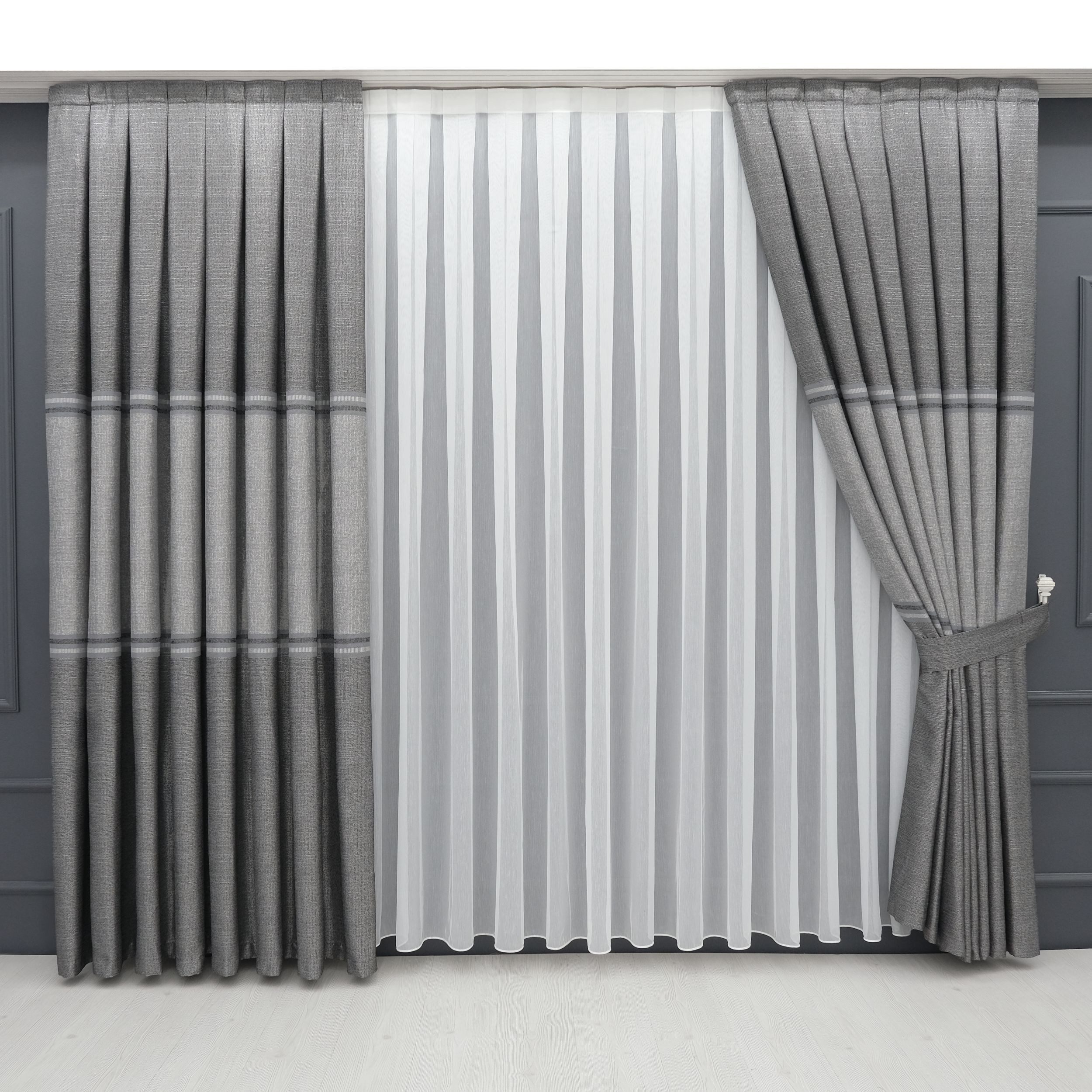 Lieferumfang | 2x Seitenschals 2x Raffhalter 1x weißer Store (Tüllgardine) |