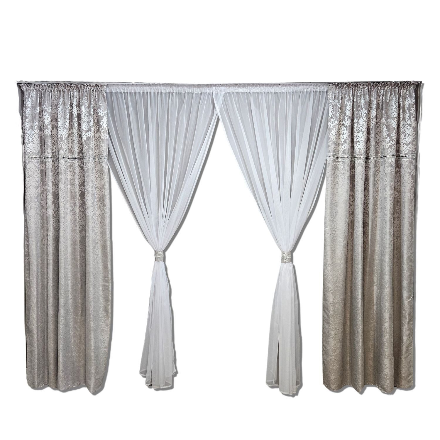 Lieferumfang | 2x Schal (Links +Rechts) 2x Weiße Gardiene (von oben zusammen genäht) 2x Klettband |