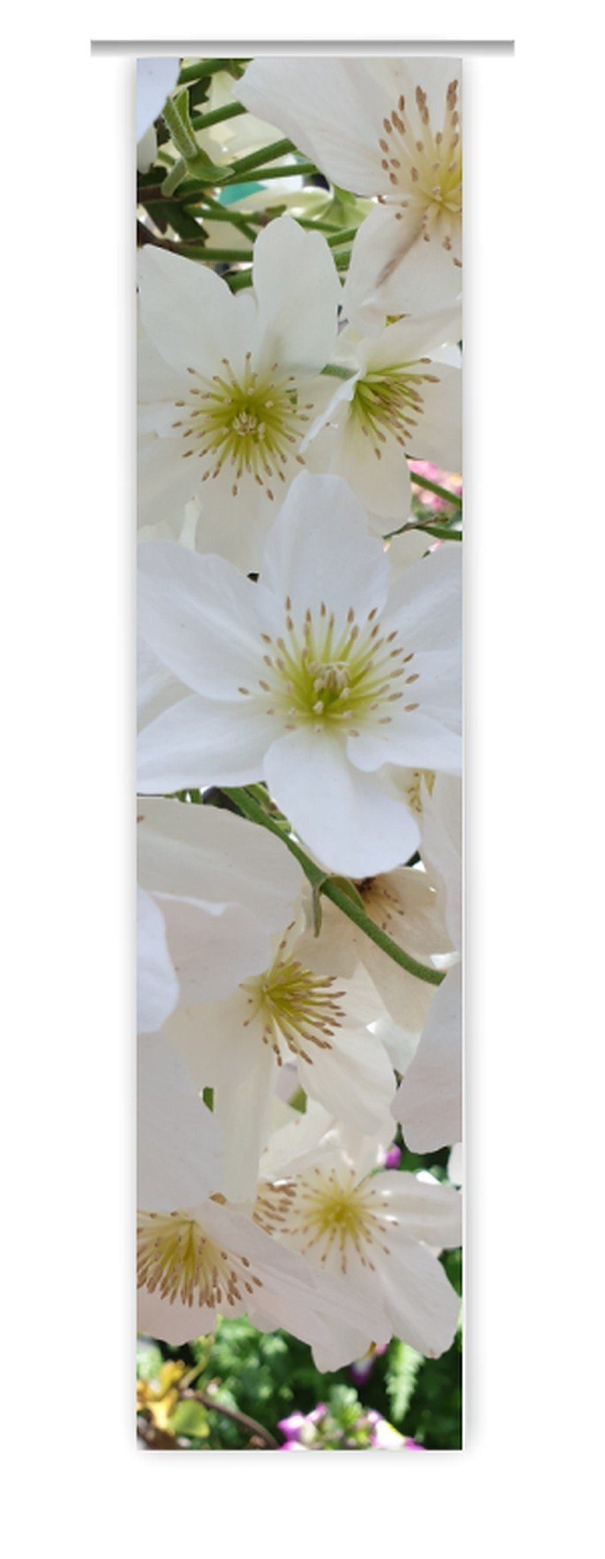 Der Flächenvorhang wird im Vollfarbdruck bedruckt. Auf der Rückseite ist der Vorhang weiß.