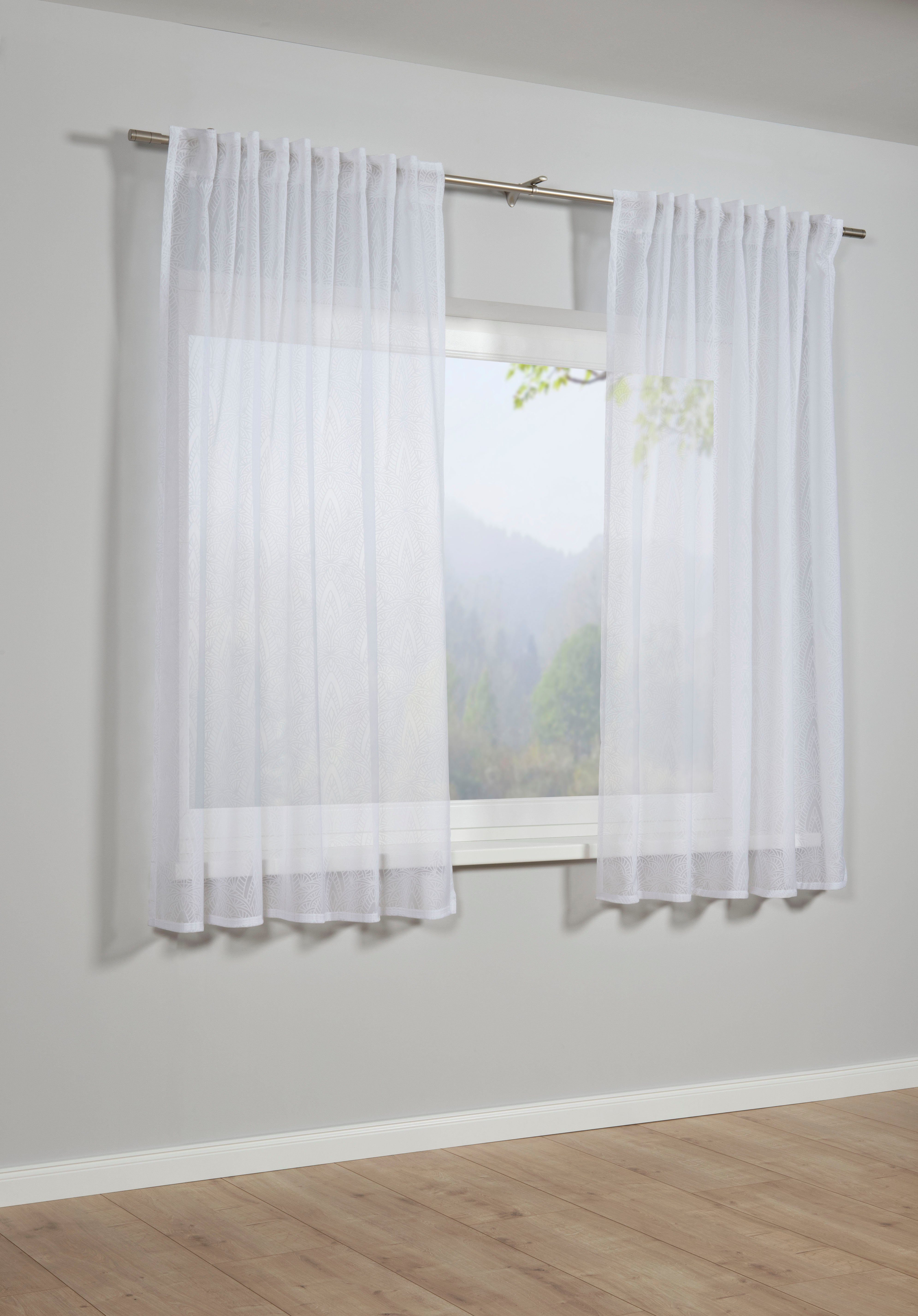 Der Ausbrenner Schal Grafik in weiß setzt Ihr Fenster gekonnt in Szene. Der transparente Stoff fällt nach dem Raffen dank des integrierten Gardinenbandes in perfekten weichen Wellen. Die Möglichkeiten des Aufhängens sind vielseitig, ob an einer Gardinenstange oder Vorhangschiene, dank der verdeckten Schlaufe mit integriertem Gardinenband ist beides möglich.