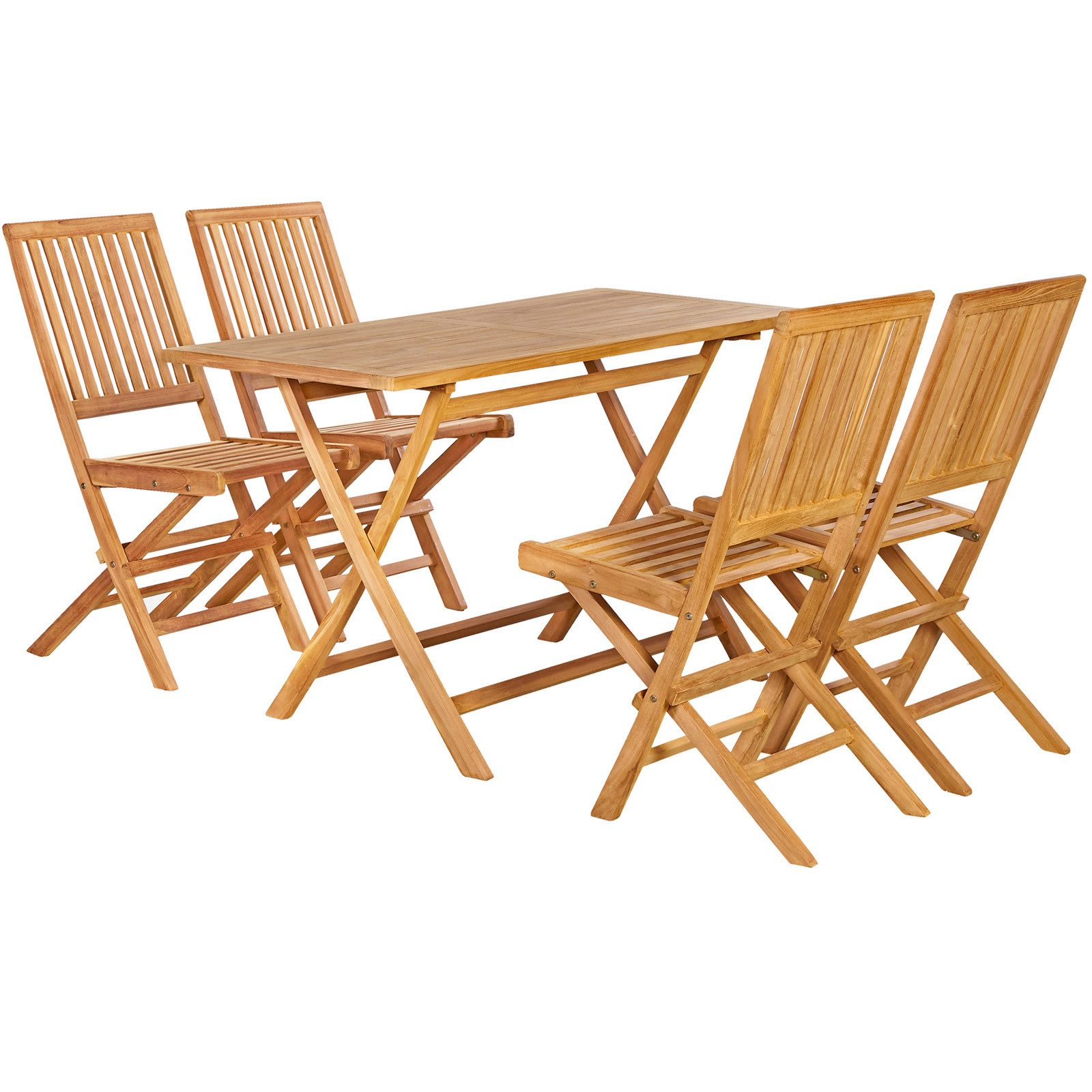 Das klappbare Gartenmöbel Set gefertigt aus SVLK zertifiziertem Teakholz aus nachhaltigem Plantagenanbau besteht aus 4 Gartenstühlen und einem Gartentisch.