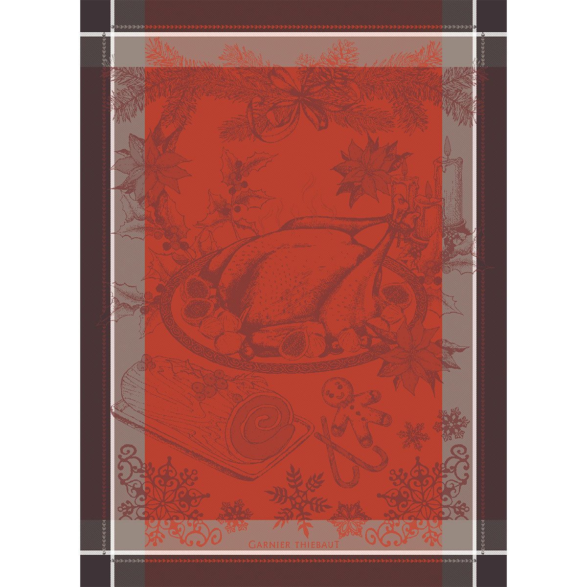 Pflegehinweise | MotivbeschreibungDieses Geschirrtuch zeigt ein festliches Weihnachtsmotiv mit einem gebratenen Truthahn, einem Bûche de Noël und Lebkuchenmännchen, umgeben von Tannenzweigen, Stechpalmen und Weihnachtssternen. Die Farbpalette ist von warmen Rottönen und Braun- und Grautönen dominiert, die eine gemütliche und festliche Atmosphäre schaffen. Das Design ist im Stil einer alten Gravur gehalten und verleiht dem Geschirrtuch einen klassischen und eleganten Touch. |