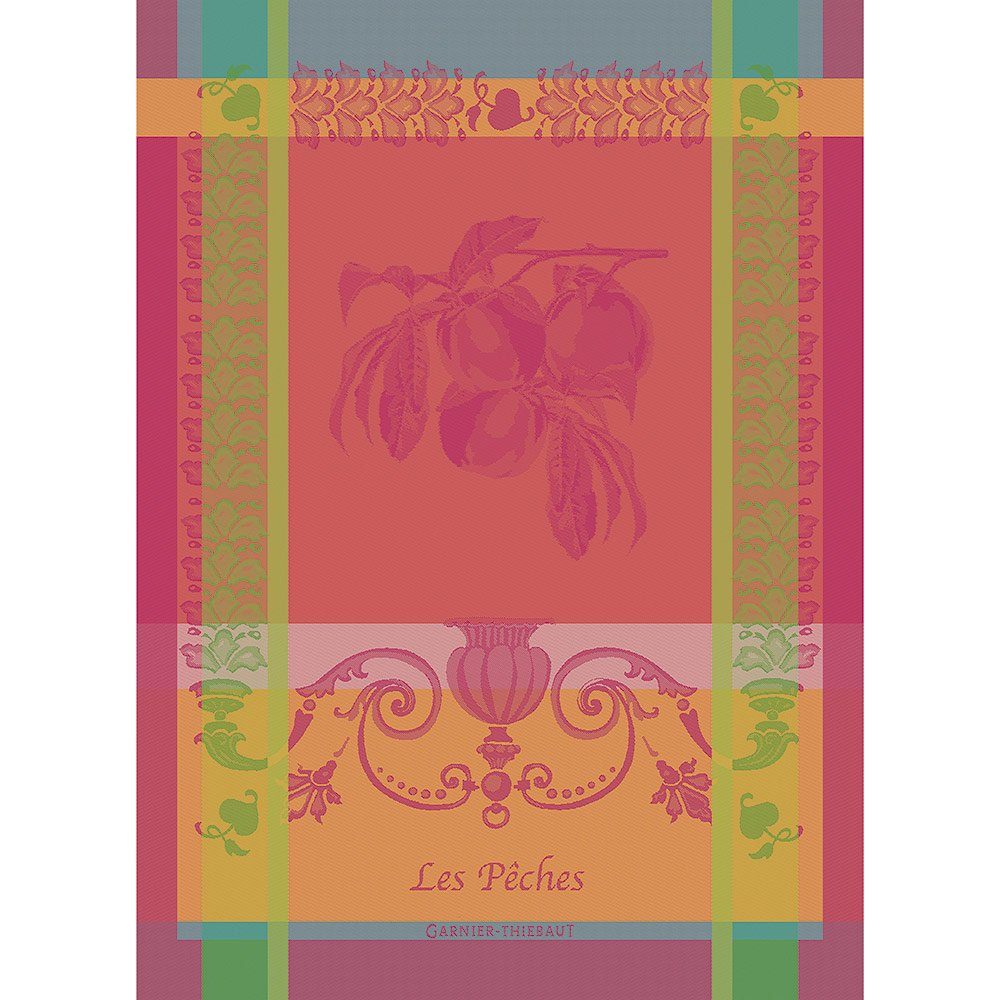 Pflegehinweise | MotivbeschreibungDieses Geschirrtuch zeigt ein lebendiges Design mit Pfirsichen an einem Ast im oberen Bereich und einem verzierten Ornament mit einer Vase im unteren Bereich. Die Farbpalette ist kräftig und sommerlich und umfasst Rottöne, Orange, Gelb, Grün und Blau, die in Streifen und Paneelen angeordnet sind. Das Motiv und die leuchtenden Farben verleihen dem Geschirrtuch ein verspieltes und dennoch elegantes Aussehen, das an einen Obstgarten erinnert. |