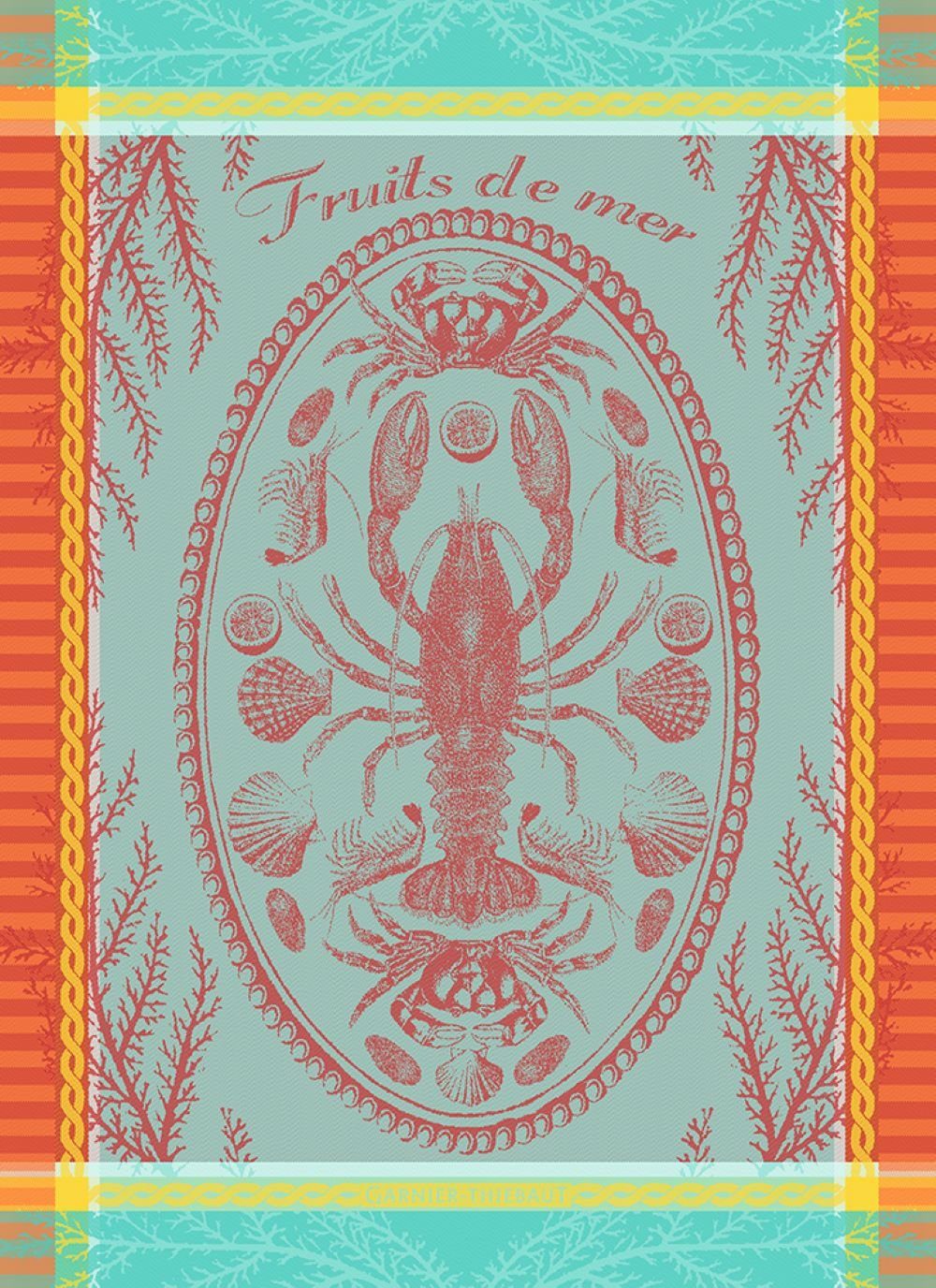 Pflegehinweise | MotivbeschreibungDieses Geschirrtuch zeigt ein ovalförmiges Design mit Meeresfrüchten, darunter ein Hummer, Krabben und Muscheln, alles in einem Vintage-Stil. Die Farbpalette besteht aus einem hellen Türkiston als Hintergrund, der mit korallenroten Illustrationen und Akzenten in Orange und Gelb kontrastiert. Das Design wird durch einen geflochtenen Rand und Streifen an den Seiten ergänzt, was ihm einen maritimen und rustikalen Charme verleiht. |