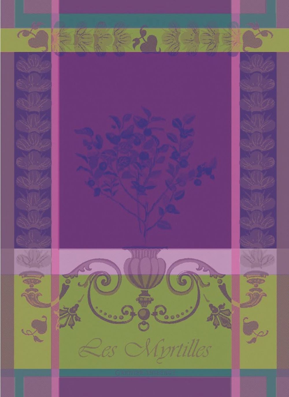 Pflegehinweise | MotivbeschreibungDieses Geschirrtuch zeigt ein stilisiertes Motiv eines Blaubeerstrauchs in einem Topf, umgeben von floralen und ornamentalen Elementen. Die Farbpalette ist kräftig und kontrastreich, dominiert von tiefem Lila und hellem Lindgrün, akzentuiert durch Streifen in Türkis und Rosa. Das Design kombiniert eine klassische Ästhetik mit einem modernen Farbschema, was ihm eine elegante und dennoch lebendige Ausstrahlung verleiht. |