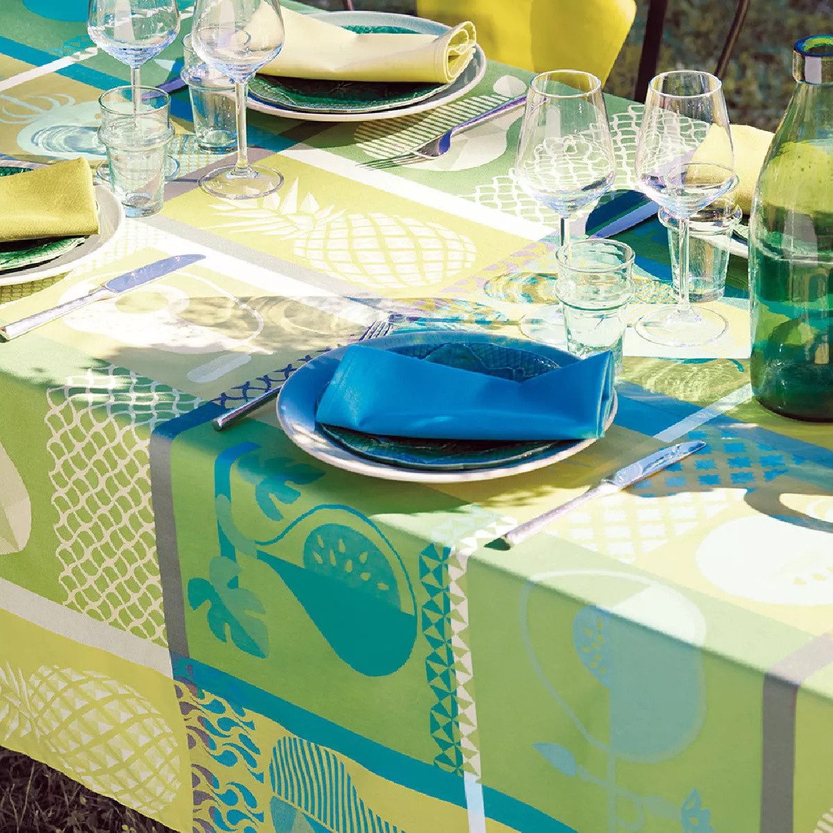 Die Garnier Thiebaut Tischdecke Mille Fruits D Ete Lime bringt sommerliche Frische auf deinen Tisch. Mit lebendigen Grüntönen und sonnigem Gelb sorgt sie für eine fröhliche, einladende Atmosphäre – perfekt für Esszimmer oder Terrasse. Dank der hochwertigen, abwaschbaren Beschichtung ist sie pflegeleicht und ideal für den Alltag. Wähle aus einer Vielzahl von Designs und Maßanfertigungen, um die perfekte Tischdecke für deinen Tisch zu finden. Besuche unser Atelier in Wesel und lass dich von unserer Auswahl inspirieren! Verleihe deinem Tisch einen Hauch von Eleganz und Sommer!