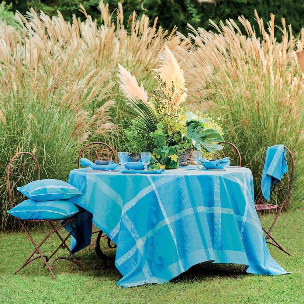 Die Garnier Thiebaut Tischdecke Mille Gardenias Lagon entführt Dich mit ihren sanften Blau- und Türkistönen in eine Welt der Ruhe und Eleganz. Inspiriert von der paradiesischen Schönheit tropischer Lagunen und der zarten Anmut von Gardenienblüten, verleiht sie Deinem Tisch eine frische, harmonische Atmosphäre. Perfekt für alle, die stilvolle Leichtigkeit mit einem Hauch von Exotik verbinden möchten. Das Design der Mille Gardenias Lagon kombiniert florale Elemente mit einer eleganten, kühlen Farbpalette. Zarte Gardenienblüten, geschwungene Muster und feine Details verschmelzen zu einem harmonischen Gesamtbild. Die Farbnuancen in Lagunenblau und sanftem Türkis erinnern an klares Wasser und sonnige Küsten – ideal für entspannte Mahlzeiten mit Urlaubsfeeling. Wie alle Tischdecken von Garnier Thiebaut besticht auch die Mille Gardenias Lagon durch ihre exzellente Qualität. Hergestellt aus 100 % hochwertiger Baumwolle, fühlt sie sich besonders angenehm an und ist gleichzeitig strapazierfähig. Die dichte Webstruktur sorgt für eine edle Optik, während die speziellen Webtechniken die Leuchtkraft der Farben langfristig bewahren. Die Tischdecke überzeugt nicht nur durch ihre Schönheit, sondern auch durch ihre praktische Handhabung. Sie ist maschinenwaschbar und bleibt dank ihrer hochwertigen Baumwollverarbeitung lange in Bestform. Selbst nach mehreren Wäschen behalten die Farben ihre Strahlkraft, sodass die Mille Gardenias Lagon stets ein stilvolles Highlight bleibt.