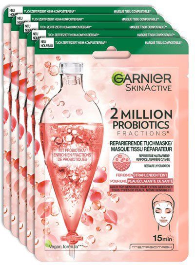 Anwendung | Vor der Verwendung der Garnier SkinActive 2 Million Probiotics Reparierende Tuchmaske das Gesicht gründlich reinigen und abtrocknen. Nun die Maske der Verpackung entnehmen und auseinanderfalten. Anschließend die Tuchmaske auf das Gesicht auflegen und an die Gesichtskonturen anpassen. Jetzt die Maske für etwa 15 Minuten einwirken lassen und im Anschluss entfernen. Die Rückstände können nun entweder in die Haut von Gesicht und Hals vorsichtig einmassiert oder aber mit einem Wattepad entfernt werden. |
