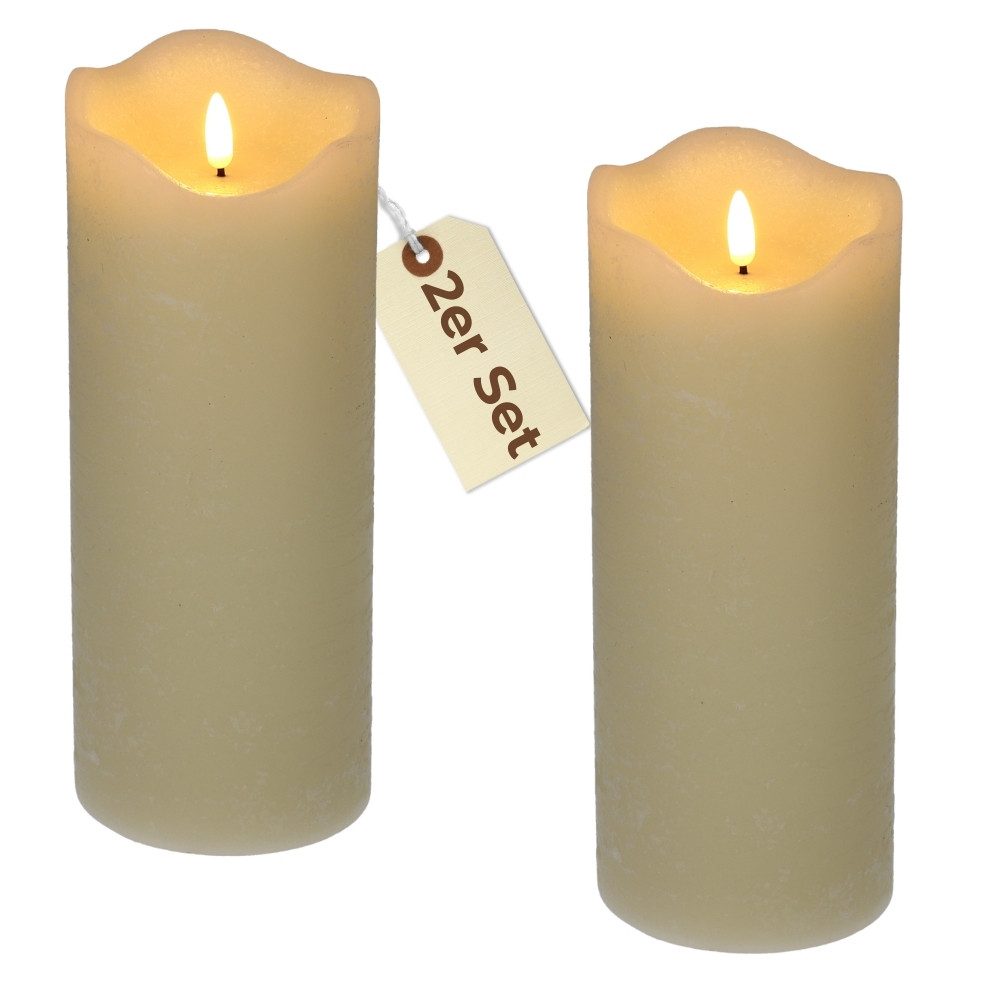 Stell Dir vor, Du hast ein 2er Set wunderschöner LED Echtwachskerzen in Creme Weiß vor Dir, jede mit den Maßen 10 x 20 cm. Diese flammenlosen Kerzen sind nicht nur ein optisches Highlight, sondern auch unglaublich praktisch. Die bewegliche Flamme flackert täuschend echt und schafft eine gemütliche Atmosphäre in Deinem Zuhause.