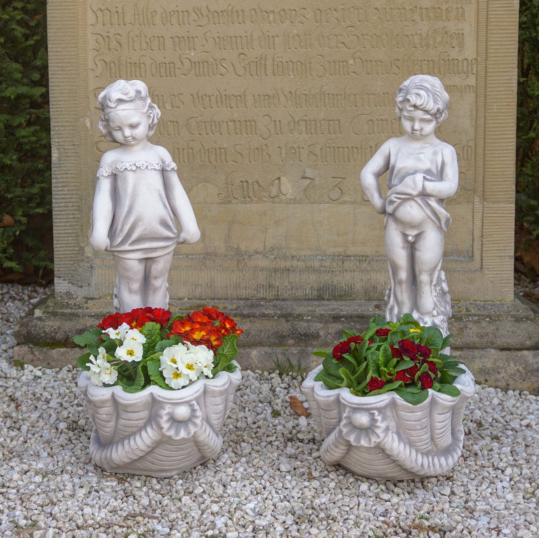 Was das kleine Mädchen wohl gerade vor hat? Sie wird doch nicht. . .? Ihr Kleidchen hat sie geschürzt, offensichtlich im Begriff, die Blumen im üppig verzierten Pflanztrog auf ihre ganz eigene Art zu gießen. Ihr kleiner Bruder ist schon etwas weiter … Beide werden auf jeden Fall für schmunzelnde Betrachter sorgen. Aber Vorsicht: Die Blumen müssen trotzdem gegossen werden.