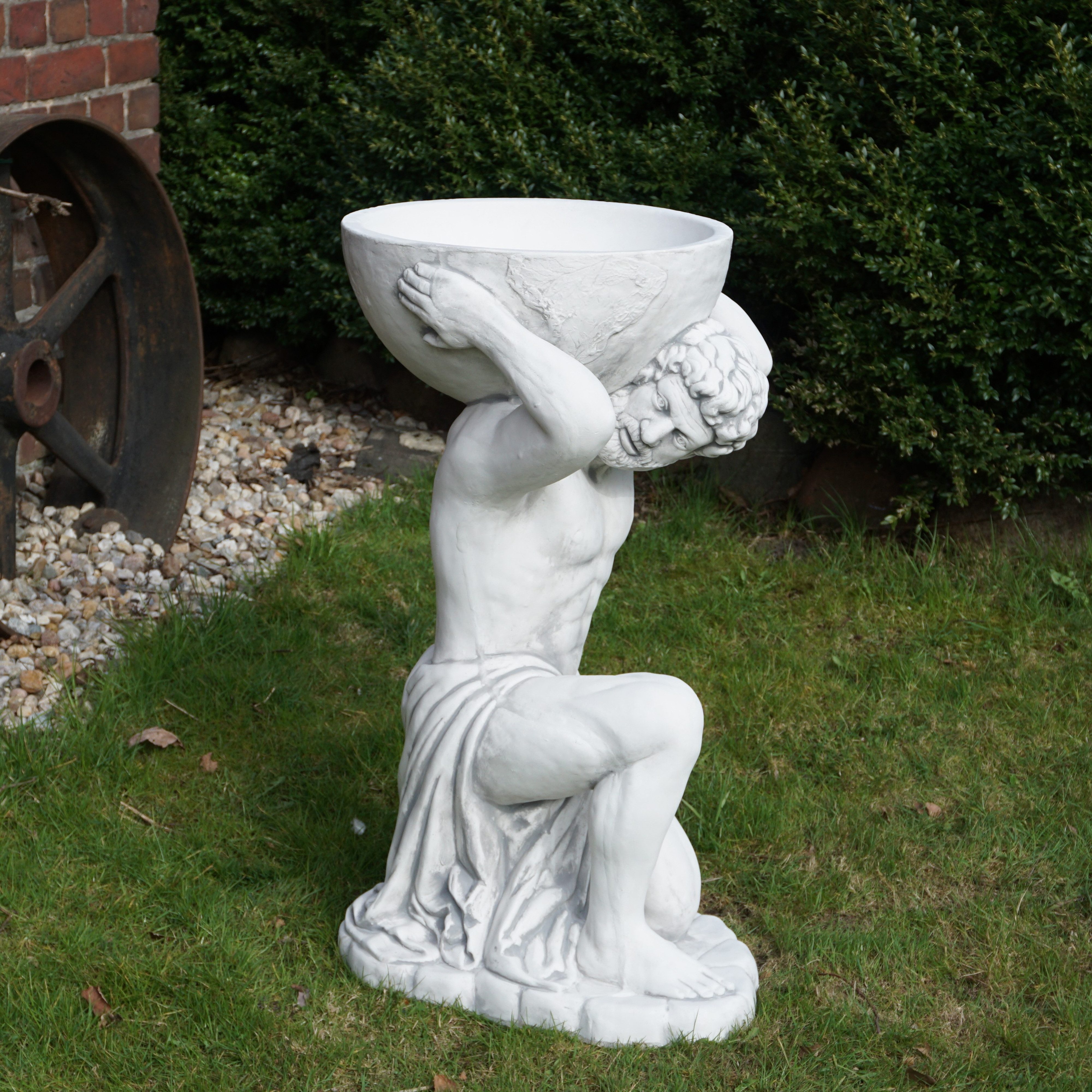 Er trägt eine große Pflanzschale auf seinen starken Schultern: Atlas. In der griechischen Mythologie trägt der Titan das Himmelsgewölbe. Atlas wurde in der Bildenden Kunst oft als Träger dargestellt, als Atlant übernahm er in der Architektur eine stützende oder dekorative Funktion. Im heimischen Garten oder auf der Terrasse wird er mit blühenden Pflanzen so ein stilbildendes Element.