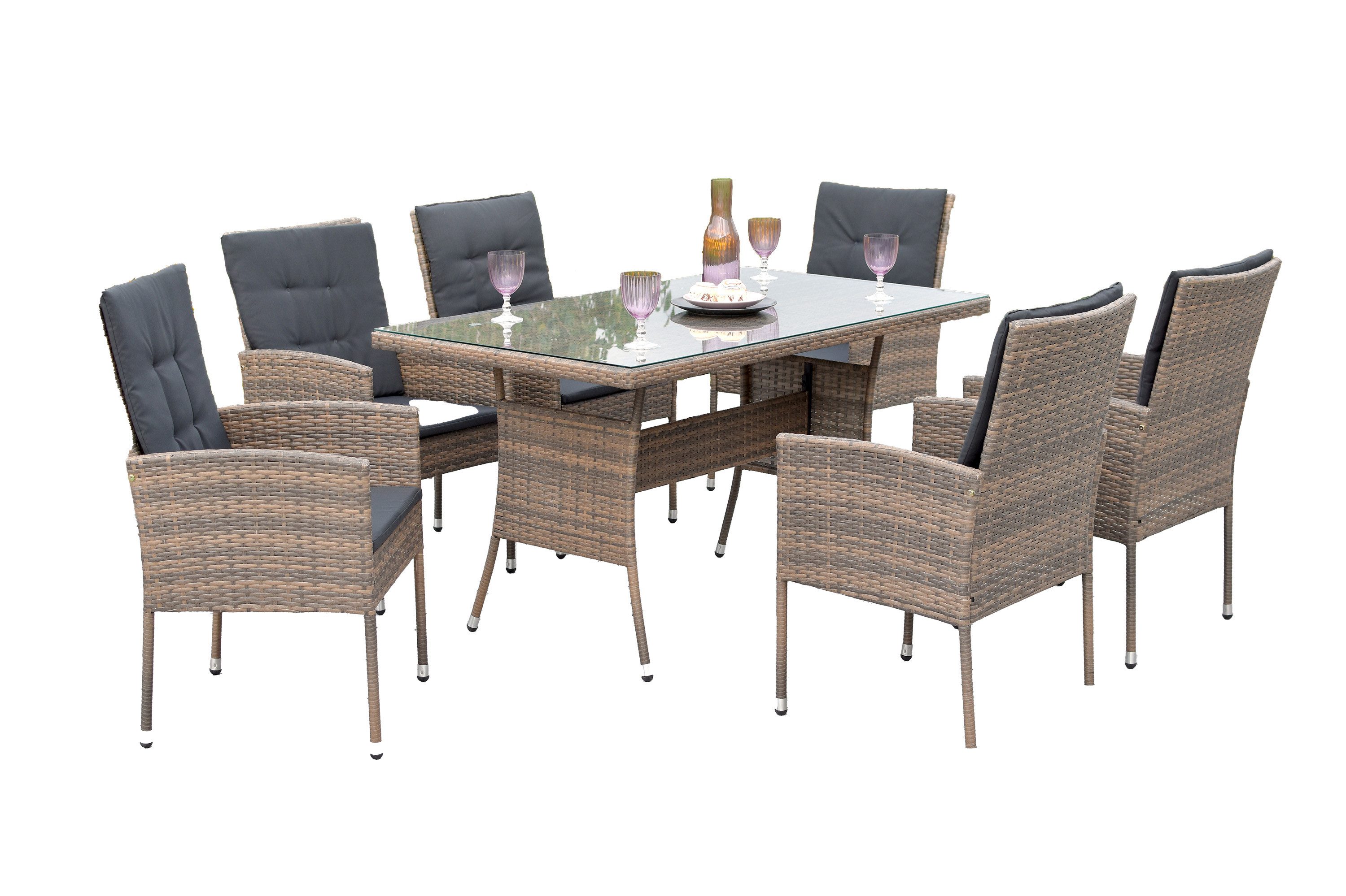 Das Set besteht aus 6 Sesseln inkl. Sitz- und Rückenkissen. Ergänzt wird das Set durch einen rechteckigen Tisch mit einer durchgeflochtenen Tischoberfläche und einer aufliegenden Sicherheitsglasplatte. Der Tisch hat die Maße 140 x 80 cm.
