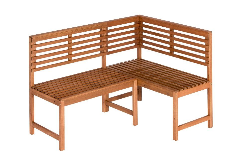 Die Eckbank ist aus geölten Eukalyptusholz in einem ansprechenden Naturton gefertigt.