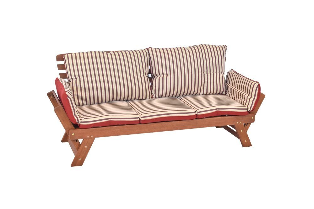 Durch abklappen der Seitenteile entsteht eine bequeme Liege. Die Liegebank wird inkl. Liege- und Wendekissen geliefert.