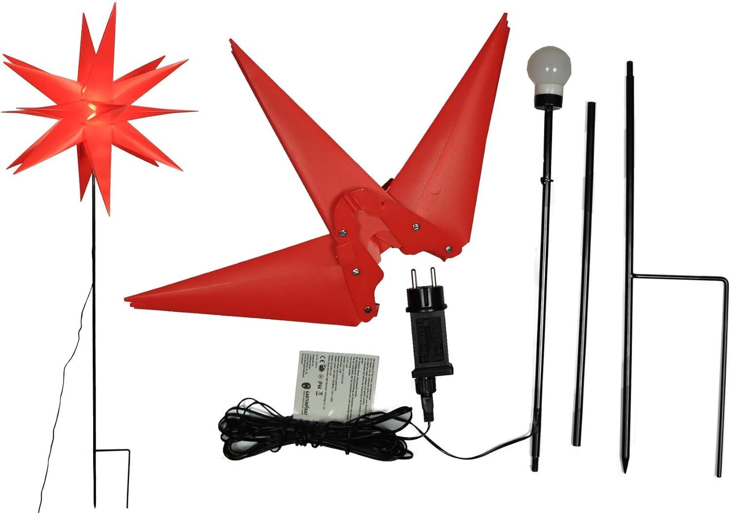 Dieser Stern am Stab ist die perfekte Dekoration für Ihren Weihnachtsgarten oder Ihr Haus. Der Stern ist aus Metall gefertigt und rot beleuchtet. Der Stab kann einfach in den Boden oder einen Topf gesteckt werden. Tagsüber und vor allem nachts scheint der Stern fast frei zu schweben, da der schwarze Metallstab kaum sichtbar ist. Dadurch erzeugt der Stern ein schönes und festliches Leuchten.