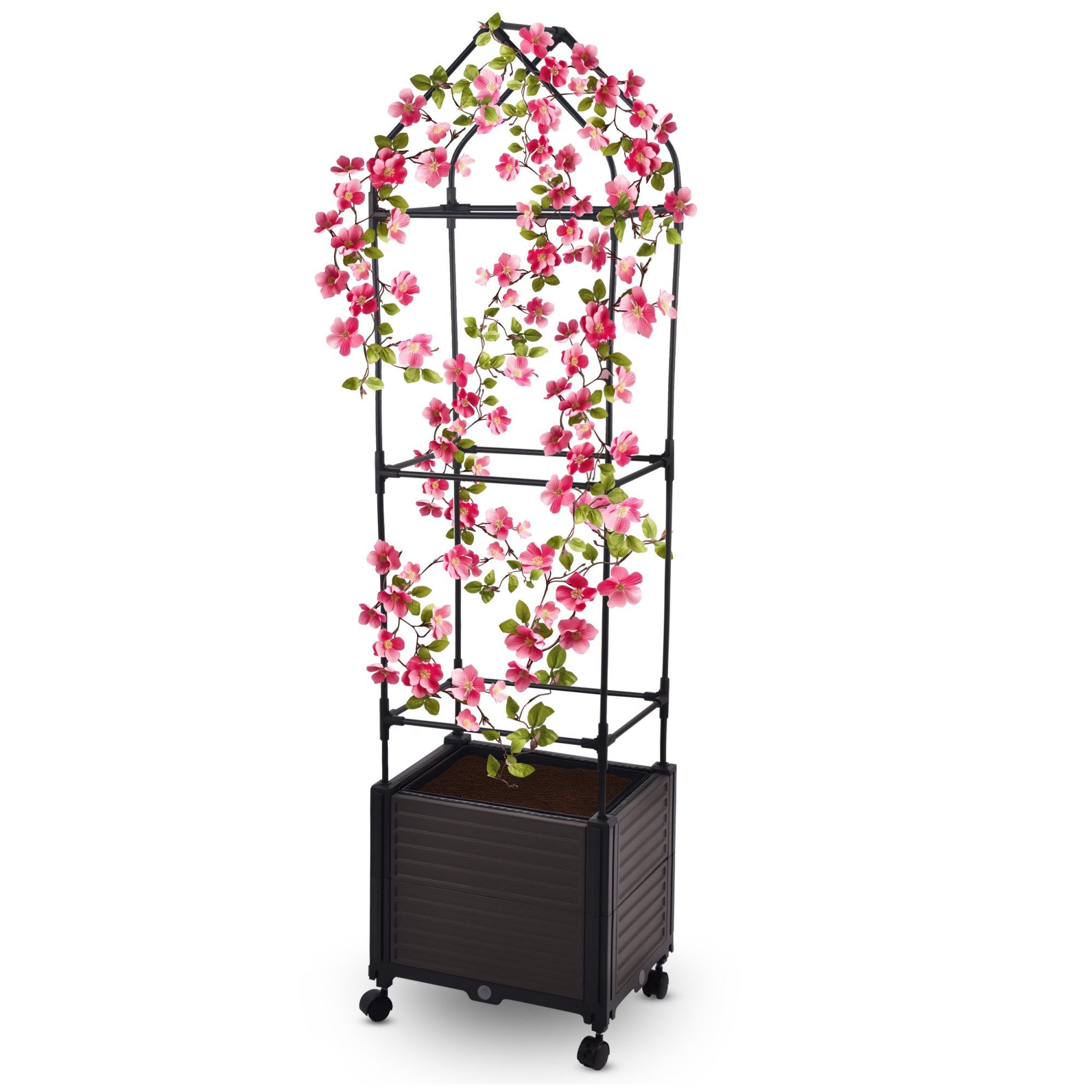 Dank der stabilen und robusten Ringklammern und der soliden Turmform ist der Kasten äußerst stabil und bietet den Pflanzen einen sicheren Halt, und dank der flexiblen Ebenen des Spaliers, lässt sich die Höhe individuell anpassen, sodass es mit dem Wachstum der Pflanze mitwachsen kann. Die Montage ist schnell und bequem und ermöglicht ein einfaches und problemloses Einsetzen und Austauschen der Pflanzen.