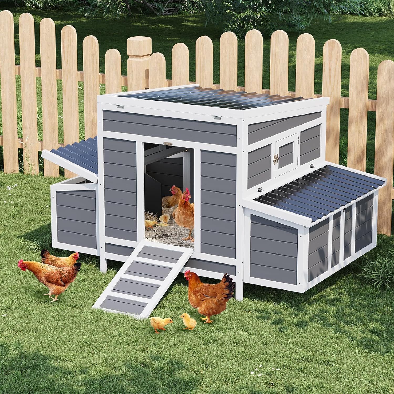 Abgetrennte Nistkästen: Zwei seitliche Nistkästen mit herausnehmbaren Trennwänden geben den Hennen genug Ruhe und Privatsphäre zum Brüten – stressfreies Schlüpfen inklusive.
