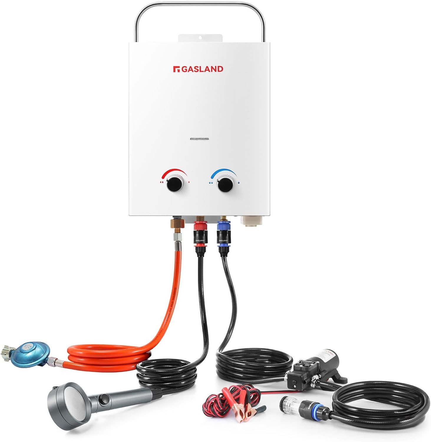 Lieferumfang | GASLAND 5L Gas Durchlauferhitzer 50 mbar Gasregler & Schlauch 150 cm Brausekopf mit Schalter Schlauchadapter Befestigungsmaterial Wasserpumpe |