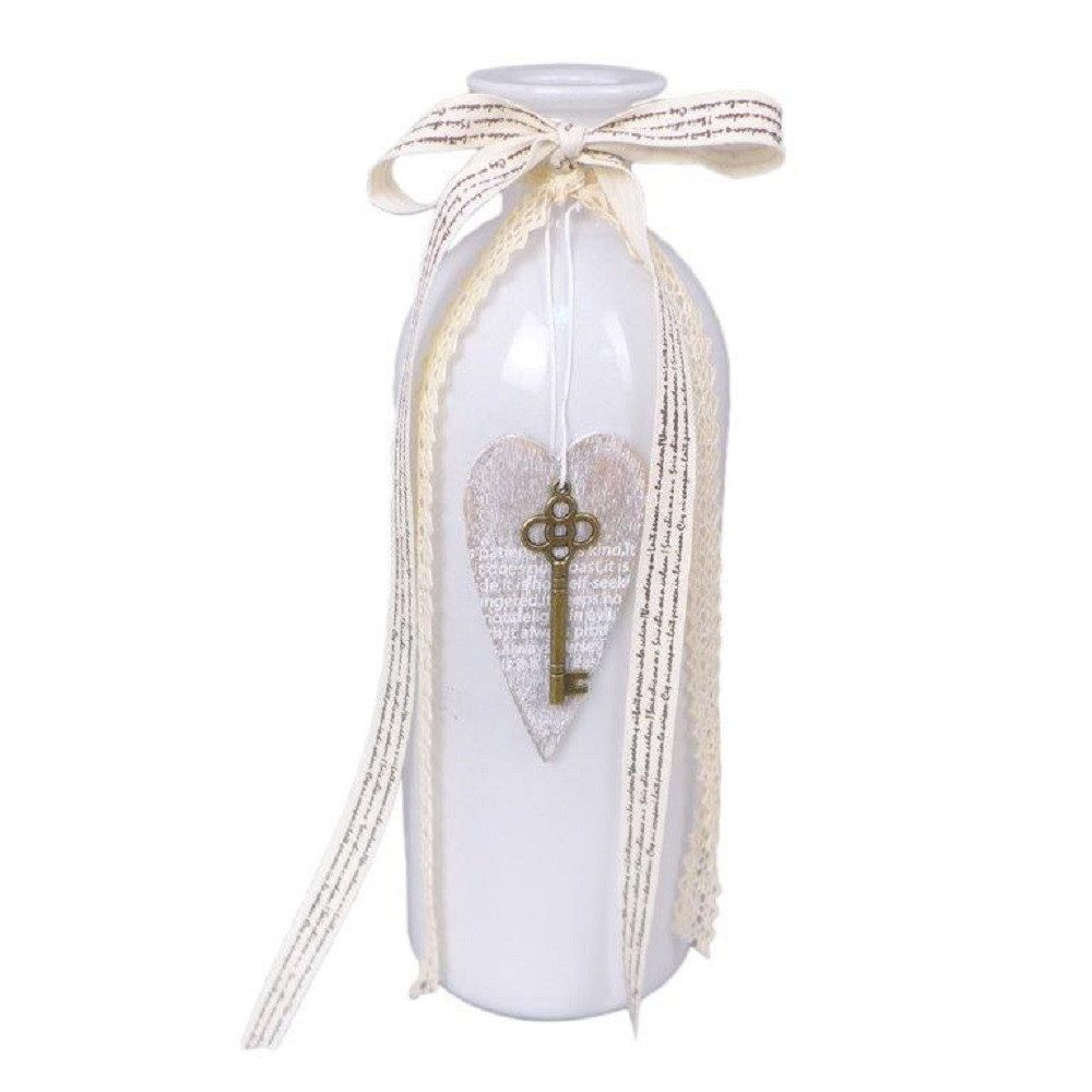 GLAS VASE mit DEKOBAND, 16cm. Band, Herz und Schlüssel. Flasche in weiß.
