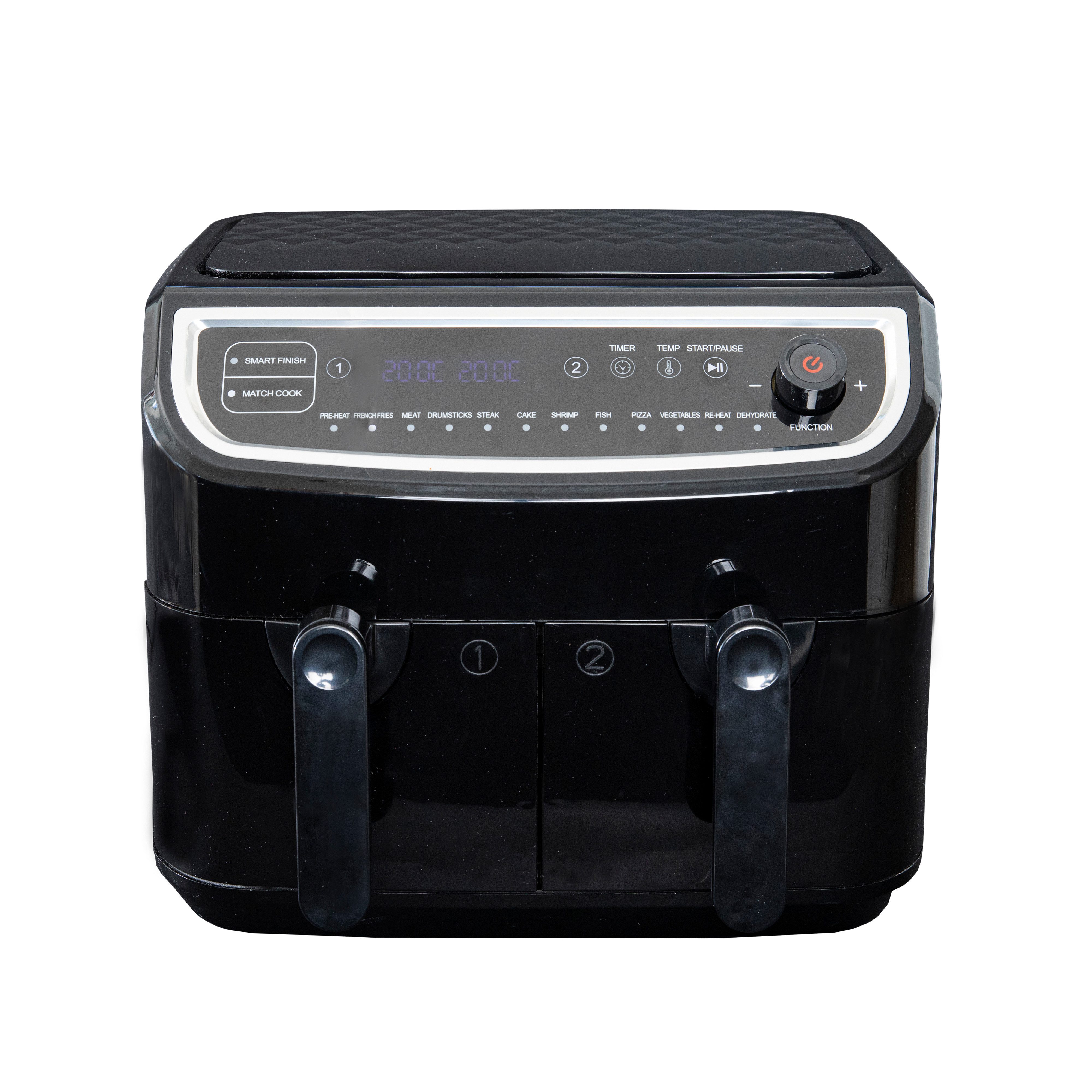Beide Körbe sind spülmaschinenfest. Die Heißluftfritteuse ist mit einem digitalen Display mit Touchscreen ausgestattet und bietet 12 automatische Programme. Die Temperatur ist zwischen 50-200°C einstellbar, und der Timer kann von 1 bis 60 Minuten eingestellt werden. Für jede einzelne Kochzone ertönt ein Signal, wenn die Garzeit abgelaufen ist. Das Gerät schaltet sich automatisch aus, sobald der Kochvorgang abgeschlossen ist.