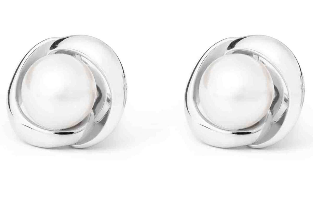 Dieser moderne Ohrstecker ist mit einer runden weiße handverlesenen natürlichen Perle in 7-7.5 mm gearbeitet, eingefasst in ausgearbeitetem 925er rhodiniertem Silber in Blütenform, ist ein echtes Markenprodukt von Gaura Pearls, Estland.