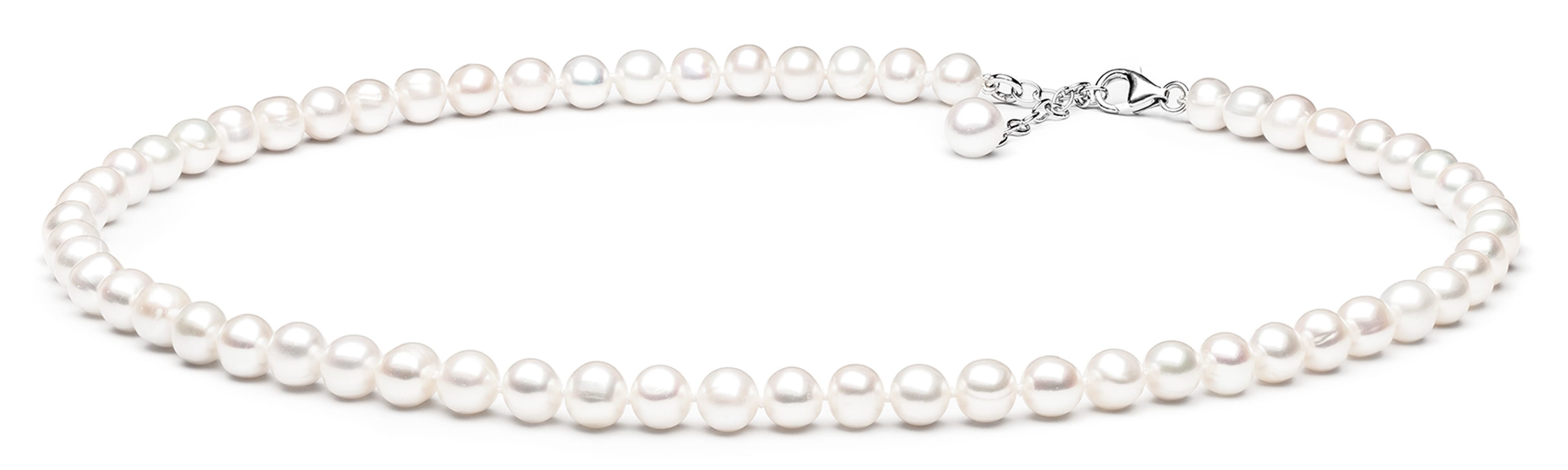 Sie wurde von den Juwelieren mit einem silbernen flexiblen Verschluss ausgestattet, der zusätzlich eine Abschlussperle besitzt. Die echte Perlenkette wird in Estland von Hand auf Perlseide aufgezogen und geknotet. Der silberne Verschluss besteht aus 925er rhodiniertem Silber. Die Rhodinierung trägt zu lange anhaltendem Glanz bei.