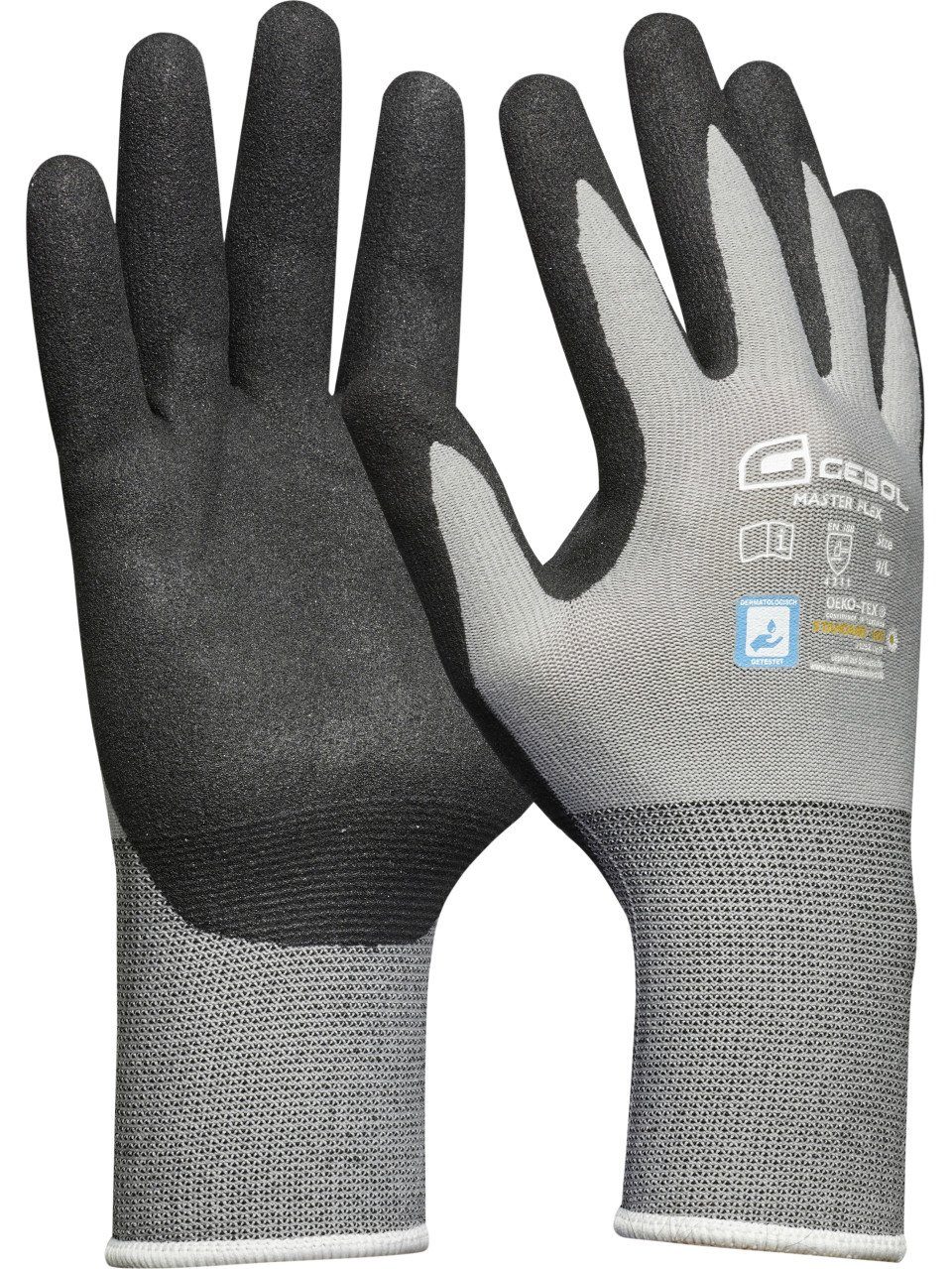 Der Gebol Arbeitshandschuh Master Flex, ein Nahtloser, leichter Feinstrick mit einer Nitril-Beschichtung mit Sandy Finish ist besonders strapazierfähig und zeigt eine hohe Abriebfestigkeit. Die Hände bleiben trocken und trotzdem ist der Master Flex atmungsaktiv. Eine Sehr gute Passform, ein bequemer Tragekomfort und eine optimale Fingerfertigkeit helfen besonders bei Arbeiten mit Kleinteilen wie z. B. im Bereich Logistik und Bühnenbau. Der sichere Griff auch bei glatten Gegenständen und die gute Beständigkeit gegen Öle und Fette machen den Master Flex universell einsetzbar. Der Arbeitshandschuh ist darüber hinaus dermatologisch getestet.