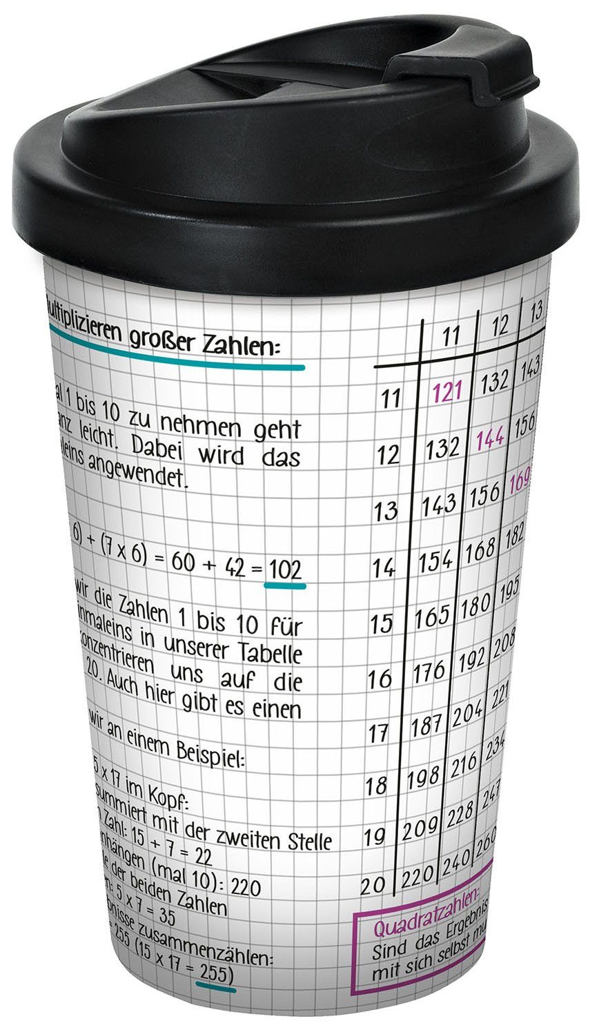 Tipps für das Multiplizieren von großen Zahlen bekommst du auf dem Coffee to go Becher mit dem Großen 1x1. Auf dem Becher aus Kunststoff sind die Matheregeln praktischerweise mit der passenden Lösungstabelle aufgedruckt. Der doppelwandige Coffee to go Becher hat einen praktischen Deckel mit Verschlussklappe, der ein Auslaufen verhindert. Ob auf dem Weg zur Schule, in der Pause oder in der Freizeit, mit dem Becher hast du Unterwegs immer dein Lieblingsgetränk dabei und nebenbei kannst du ein wenig Rechnen üben. Durch mehrfaches Benutzen schonst du die Umwelt und vermeidest unnötigen Abfall.