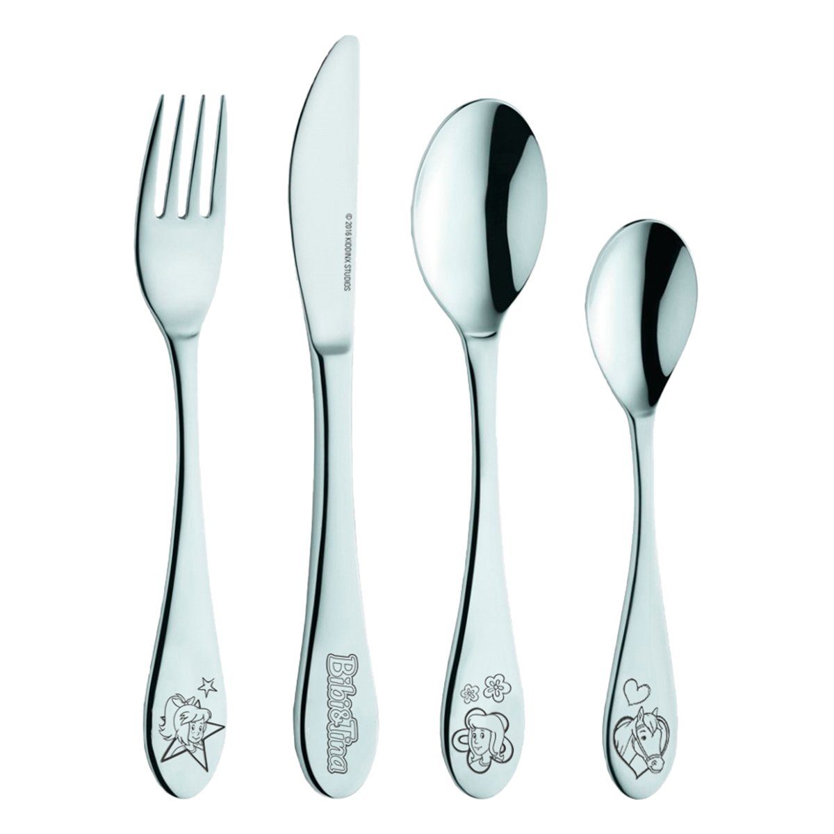 Das Kinderbesteck Set mit Bibi & Tina passt perfekt zu unseren Kindergeschirr Sets. Das Edelstahl Besteckset ist 4-teilig und besteht aus einer Gabel, einem Messer, einem großen und einem kleinen Löffel. Es ist spülmaschinengeeignet und lebensmittelecht. Das Besteck hat eine eingestanzte Motive von Bibi Blocksberg, ihrerer Freundin Tina und dem Pferd Amadeus.