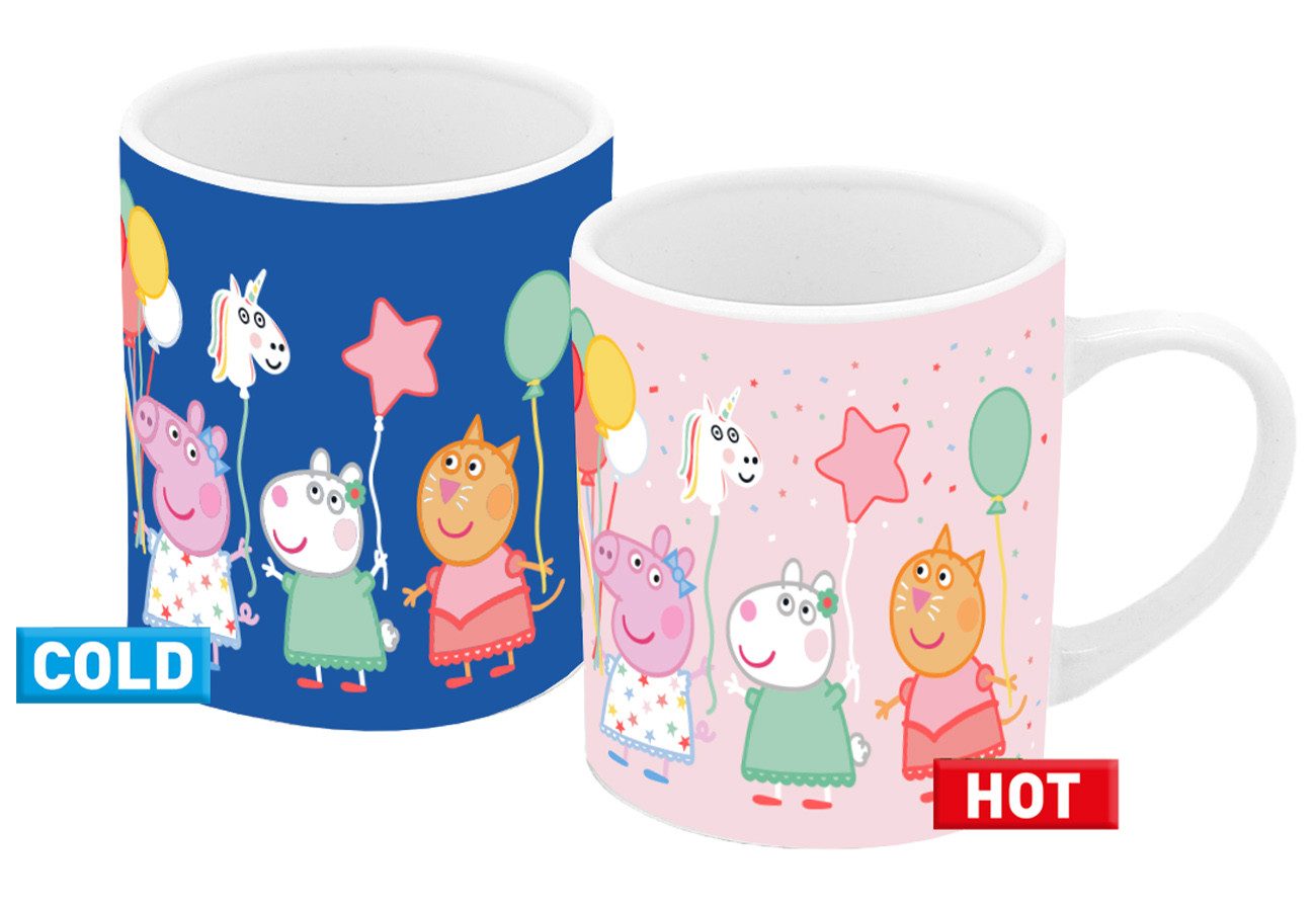 Wer hat Lust auf eine bunte Party? Befülle die Tasse mit deinem warmen Lieblingsgetränk (mindestens 45°) und wie durch Zauberei verwandelt sich das dunkelblaue Design der Tasse in einen rosa Partytraum. Entdecke Peppa Pig und ihre Freunde, wie sie fröhlich mit Konfetti und Luftballons eine kleine Party feiern. Die Tasse aus Keramik hat ca. 250ml Füllmenge und ist nicht spülmaschinengeeignet und nicht mikrowellengeeignet!