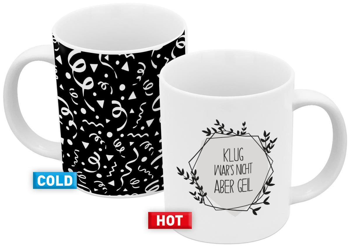 Die Tasse Klug wars nicht aber geil Farbwechsel 330ml besteht aus Porzellan. Die witzige Spruchtasse ändert ihr Motiv, wenn heiße Getränke eingegossen werden. Im kalten Zustand ist sie schwarz mit weißen Luftschlangen. Im heißen Zustand verschwindet die dunkle Farbe und der freche Spruch „Klug wars nicht aber geil“ wird sichtbar. Das Motiv ist auf beiden Seiten aufgedruckt. Die Tasse mit Thermoeffekt ist nicht spülmaschinenfest und nicht mikrowellengeeignet. Dieses Produkt ist eine schöne Geschenkidee für Freunde, Kolleginnen und Kollegen.
