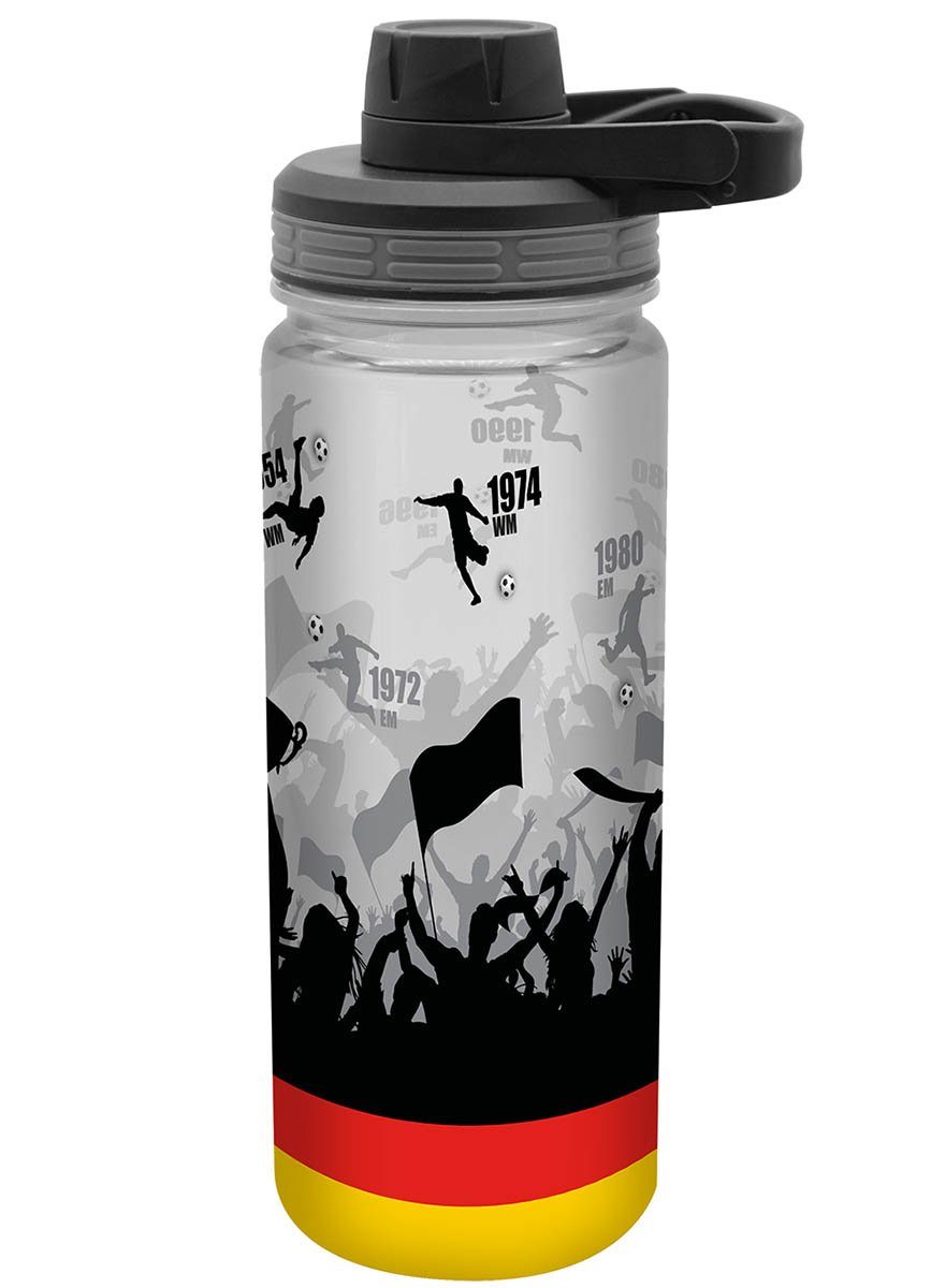 Die Trinkflasche Fußball Titel 750 ml besteht aus robustem Tritan. Der praktische Schraubdeckelverschluss bleibt einfach am Deckel und kann somit nicht verloren gehen. Das Design der Flasche ist den gewonnen Weltmeisterschaften der Deutschen Nationalmannschaft gewidmet. Mit 750 ml Fassungsvermögen bietet die Flasche genügend Flüssigkeit und ist ein perfekter Begleiter für deinen Isotonischen Drink während des Trainings oder beim Sport in der Schule.