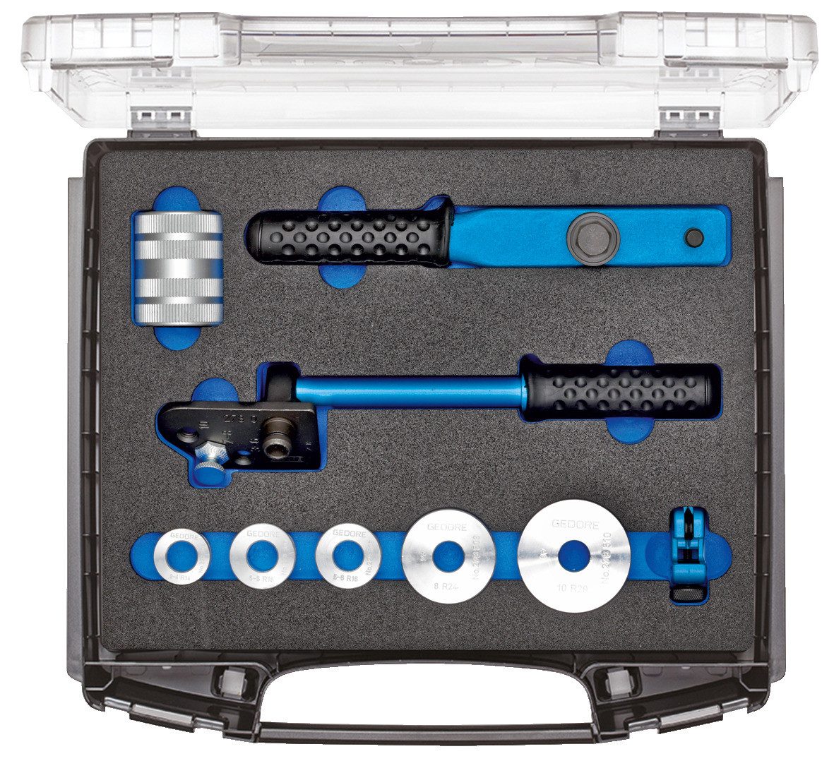 Abmessungen von 3 bis 10 mm Ø bis 180°, Für Präzisionsstahlrohre EN 10305-3 (DIN 2394), Hydraulikrohre EN 10305-1 (DIN 2391) mit Wandstärken von 0,75 - 1,0 mm sowie biegefähige Edelstahlrohre mit Wandstärke von 1,0 mm, Mit 5 Biegeformen aus hochfestem Aluminium für Rohre mit Ø 3-4, 5, 6, 8 und 10 mm, Zum Einspannen im Schraubstock oder als Biegezange einsetzbar, Mit Rohrabschneider No. 231011 und Rohrfräser No. 232501, Lieferung in GEDORE i-BOXX® 72 No. 1101 L, Maße: B 367 x T 316 x H 72 mm