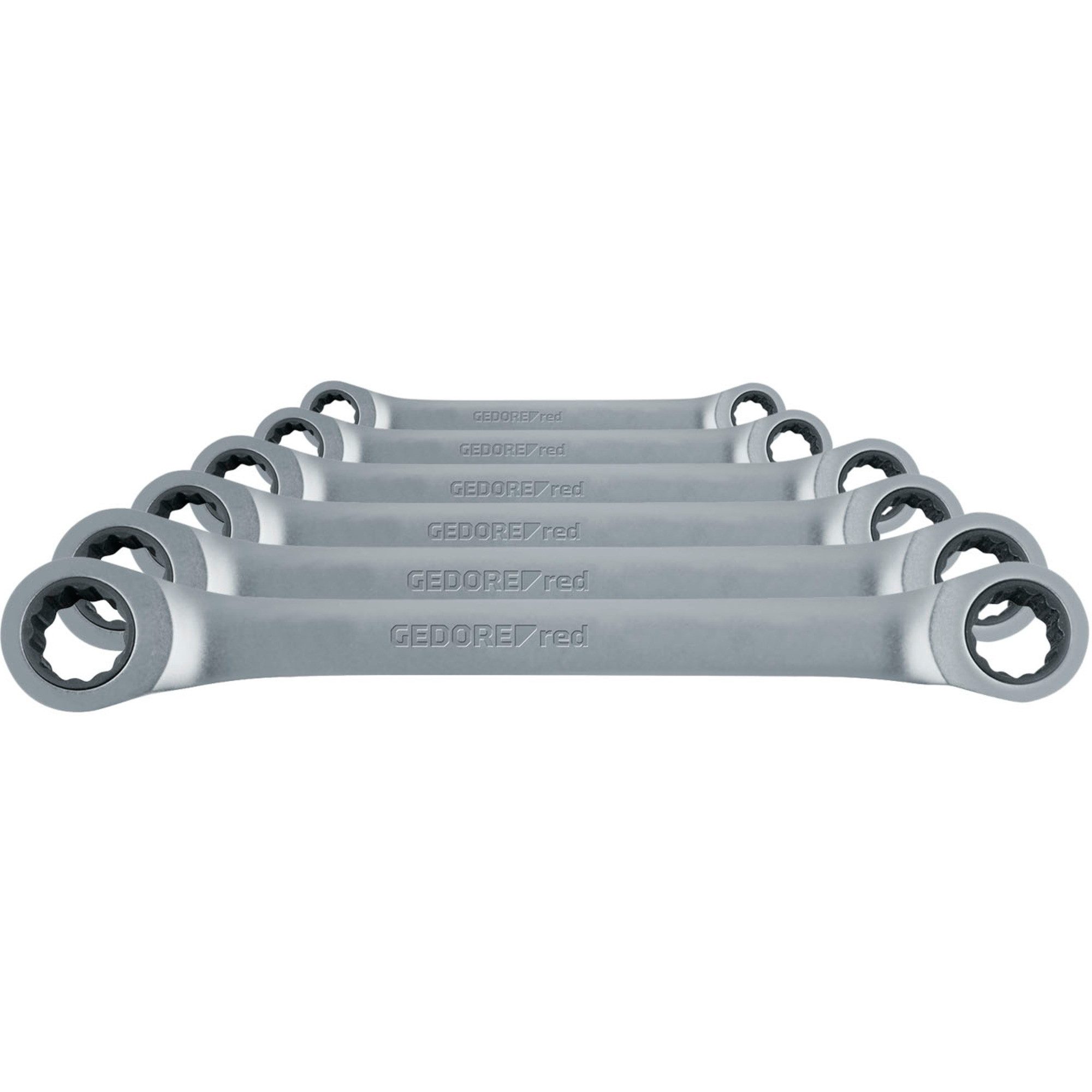 SW 8 - 19mm Der Doppel-Ringratschenschlüssel-Satz R07405006 von GEDORE Red enthält 6 Ringratschen-Schlüssel mit beidseitig unterschiedlichen Schlüsselweiten in einem Halter. Der Ratschenkopf ist gerade. Der Ratschenmechanismus ist feinverzahnt mit 72 Zähnen, der Rückschwenkwinkel beträgt nur 5°. Die Schlüssel sind aus Chrom-Vanadium-Stahl gefertigt und matt verchromt. Der Satz R07405006 ist in Anlehnung an DIN 3113, ISO 3318 hergestellt und enthält gängige Größen in praxisgerechter Zusammenstellung.