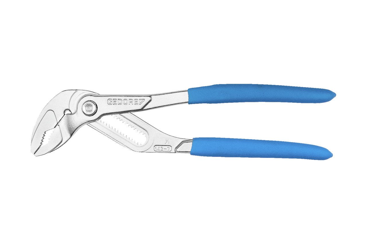 Ausführung nach DIN ISO 8976 Form C, Mit durchgestecktem Gelenk und Klemmschutz, Feinverstellung per Druckknopf, Druckknopf-Einhandverstellung mit großer Betätigungsfläche, Schmaler Zangenkopf für schwer zugängliche Stellen, Lange Zangenbacken, Versetzte Greifflächen, selbstklemmend an Muttern und Rohren, GEDORE Chrom-Vanadium-Sonderstahl, Zähne induktiv gehärtet, Ausführung JC = verchromt, mit 2-Komponenten-Griffhüllen, Ausführung C = schlanke Griffschenkel mit geschmiedeter Riffelung, Ausführung TL = stahlgrau, mit blau getauchten Antirutsch-Griffen, Spannweite 37 mm